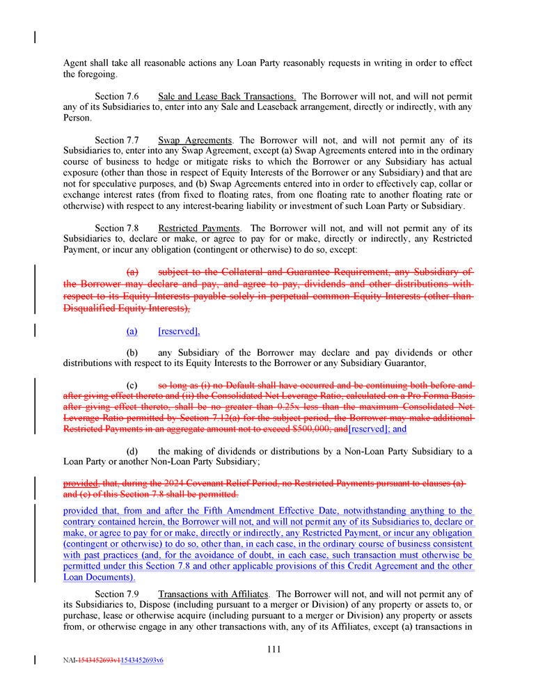 Agent shall take all reasonable actions any Loan Party reasonably requests in writing in order to effect the foregoing . Section 7 . 6 Sale and Lease Back Transactions . The Borrower will not, and will not permit any of its Subsidiaries to, enter into any Sale and Leaseback arrangement, directly or indirectly, with any Person . Section 7 . 7 Swap Agreements . The Borrower will not, and will not permit any of its Subsidiaries to, enter into any Swap Agreement, except (a) Swap Agreements entered into in the ordinary course of business to hedge or mitigate risks to which the Borrower or any Subsidiary has actual exposure (other than those in respect of Equity Interests of the Borrower or any Subsidiary) and that are not for speculative purposes, and (b) Swap Agreements entered into in order to effectively cap, collar or exchange interest rates (from fixed to floating rates, from one floating rate to another floating rate or otherwise) with respect to any interest - bearing liability or investment of such Loan Party or Subsidiary . Section 7 . 8 Restricted Payments . The Borrower will not, and will not permit any of its Subsidiaries to, declare or make, or agree to pay for or make, directly or indirectly, any Restricted Payment, or incur any obligation (contingent or otherwise) to do so, except : (a) subject to the Collateral and Guarantee Requirement, any Subsidiary of the Borrower may declare and pay, and agree to pay, dividends and other distributions with respect to its Equity Interests payable solely in perpetual common Equity Interests (other than Disqualified Equity Interests), (a) [reserved], (b) any Subsidiary of the Borrower may declare and pay dividends or other distributions with respect to its Equity Interests to the Borrower or any Subsidiary Guarantor, (c) so long as (i) no Default shall have occurred and be continuing both before and after giving effect thereto and (ii) the Consolidated Net Leverage Ratio, calculated on a Pro Forma Basis after giving effect thereto, shall be no greater than 0 . 25 x less than the maximum Consolidated Net Leverage Ratio permitted by Section 7 . 12 (a) for the subject period, the Borrower may make additional Restricted Payments in an aggregate amount not to exceed $ 500 , 000 ; and [reserved] ; and (d) the making of dividends or distributions by a Non - Loan Party Subsidiary to a Loan Party or another Non - Loan Party Subsidiary ; provided , that, during the 2024 Covenant Relief Period, no Restricted Payments pursuant to clauses (a) and (c) of this Section 7 . 8 shall be permitted . provided that, from and after the Fifth Amendment Effective Date, notwithstanding anything to the contrary contained herein, the Borrower will not, and will not permit any of its Subsidiaries to, declare or make, or agree to pay for or make, directly or indirectly, any Restricted Payment, or incur any obligation (contingent or otherwise) to do so, other than, in each case, in the ordinary course of business consistent with past practices (and, for the avoidance of doubt, in each case, such transaction must otherwise be permitted under this Section 7 . 8 and other applicable provisions of this Credit Agreement and the other Loan Documents) . Section 7 . 9 Transactions with Affiliates . The Borrower will not, and will not permit any of its Subsidiaries to, Dispose (including pursuant to a merger or Division) of any property or assets to, or purchase, lease or otherwise acquire (including pursuant to a merger or Division) any property or assets from, or otherwise engage in any other transactions with, any of its Affiliates, except (a) transactions in 111 NAI - 1543452693v1 1543452693v6