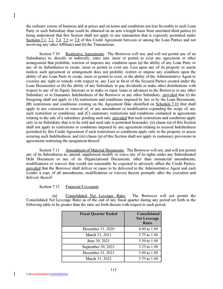 Consolidated Net Leverage Ratio Fiscal Quarter Ended 4.00 to 1.00 December 31, 2020 3.75 to 1.00 March 31, 2021 3.50 to 1.00 June 30, 2021 3.25 to 1.00 September 30, 2021 3.00 to 1.00 December 31, 2021 3.75 to 1.00 March 31, 2022 112 NAI - 1543452693v1 1543452693v6 the ordinary course of business and at prices and on terms and conditions not less favorable to such Loan Party or such Subsidiary than could be obtained on an arm’s - length basis from unrelated third parties (it being understood that this Section shall not apply to any transaction that is expressly permitted under Sections 7 . 1 , 7 . 3 , 7 . 4 , 7 . 5 or 7 . 8 of this Credit Agreement between or among the Loan Parties and not involving any other Affiliate) and (b) the Transactions . Section 7 . 10 Restrictive Agreements . The Borrower will not, and will not permit any of its Subsidiaries to, directly or indirectly, enter into, incur or permit to exist any agreement or other arrangement that prohibits, restricts or imposes any condition upon (a) the ability of any Loan Party or any of its Subsidiaries to create, incur or permit to exist any Lien upon any of its property or assets (unless such agreement or arrangement does not prohibit, restrict or impose any condition upon the ability of any Loan Party to create, incur or permit to exist, or the ability of the Administrative Agent to exercise any right or remedy with respect to, any Lien in favor of the Secured Parties created under the Loan Documents) or (b) the ability of any Subsidiary to pay dividends or make other distributions with respect to any of its Equity Interests or to make or repay loans or advances to the Borrower or any other Subsidiary or to Guarantee Indebtedness of the Borrower or any other Subsidiary, provided that (i) the foregoing shall not apply to (A) restrictions and conditions imposed by law or by the Loan Documents, (B) restrictions and conditions existing on the Agreement Date identified on Schedule 7 . 10 (but shall apply to any extension or renewal of, or any amendment or modification expanding the scope of, any such restriction or condition), and (C) customary restrictions and conditions contained in agreements relating to the sale of a subsidiary pending such sale ; provided that such restrictions and conditions apply only to its Subsidiary that is to be sold and such sale is permitted hereunder, (ii) clause (a) of this Section shall not apply to restrictions or conditions imposed by any agreement relating to secured Indebtedness permitted by this Credit Agreement if such restrictions or conditions apply only to the property or assets securing such Indebtedness, and (iii) clause (a) of this Section shall not apply to customary provisions in agreements restricting the assignment thereof . Section 7 . 11 Amendment of Material Documents . The Borrower will not, and will not permit any of its Subsidiaries to, amend, supplement modify or waive any of its rights under any Subordinated Debt Document or any of its Organizational Documents, other than immaterial amendments, modifications or waivers that would not reasonably be expected to adversely affect the Credit Parties, provided that the Borrower shall deliver or cause to be delivered to the Administrative Agent and each Lender a copy of all amendments, modifications or waivers thereto promptly after the execution and delivery thereof . Section 7.12 Financial Covenants . (a) Consolidated Net Leverage Ratio . The Borrower will not permit the Consolidated Net Leverage Ratio as of the end of any fiscal quarter during any period set forth in the following table to be greater than the ratio set forth therein with respect to such period :