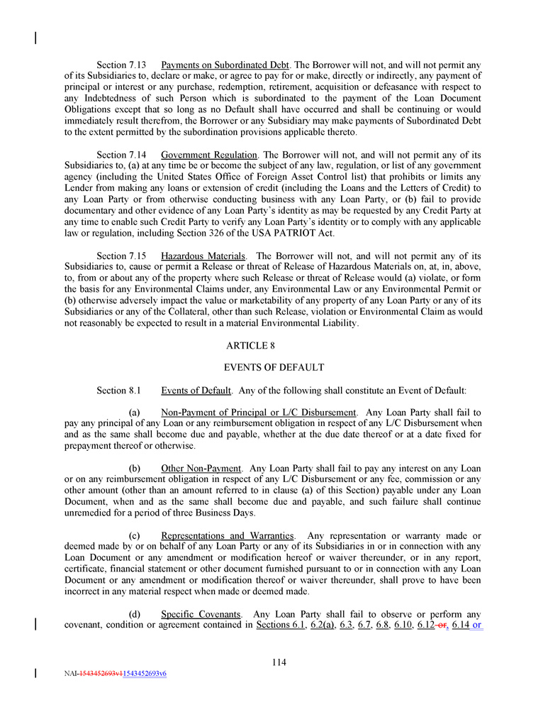 Section 7 . 13 Payments on Subordinated Debt . The Borrower will not, and will not permit any of its Subsidiaries to, declare or make, or agree to pay for or make, directly or indirectly, any payment of principal or interest or any purchase, redemption, retirement, acquisition or defeasance with respect to any Indebtedness of such Person which is subordinated to the payment of the Loan Document Obligations except that so long as no Default shall have occurred and shall be continuing or would immediately result therefrom, the Borrower or any Subsidiary may make payments of Subordinated Debt to the extent permitted by the subordination provisions applicable thereto . Section 7 . 14 Government Regulation . The Borrower will not, and will not permit any of its Subsidiaries to, (a) at any time be or become the subject of any law, regulation, or list of any government agency (including the United States Office of Foreign Asset Control list) that prohibits or limits any Lender from making any loans or extension of credit (including the Loans and the Letters of Credit) to any Loan Party or from otherwise conducting business with any Loan Party, or (b) fail to provide documentary and other evidence of any Loan Party’s identity as may be requested by any Credit Party at any time to enable such Credit Party to verify any Loan Party’s identity or to comply with any applicable law or regulation, including Section 326 of the USA PATRIOT Act . Section 7 . 15 Hazardous Materials . The Borrower will not, and will not permit any of its Subsidiaries to, cause or permit a Release or threat of Release of Hazardous Materials on, at, in, above, to, from or about any of the property where such Release or threat of Release would (a) violate, or form the basis for any Environmental Claims under, any Environmental Law or any Environmental Permit or (b) otherwise adversely impact the value or marketability of any property of any Loan Party or any of its Subsidiaries or any of the Collateral, other than such Release, violation or Environmental Claim as would not reasonably be expected to result in a material Environmental Liability . ARTICLE 8 EVENTS OF DEFAULT Section 8.1 Events of Default . Any of the following shall constitute an Event of Default: (a) Non - Payment of Principal or L/C Disbursement . Any Loan Party shall fail to pay any principal of any Loan or any reimbursement obligation in respect of any L/C Disbursement when and as the same shall become due and payable, whether at the due date thereof or at a date fixed for prepayment thereof or otherwise . (b) Other Non - Payment . Any Loan Party shall fail to pay any interest on any Loan or on any reimbursement obligation in respect of any L/C Disbursement or any fee, commission or any other amount (other than an amount referred to in clause (a) of this Section) payable under any Loan Document, when and as the same shall become due and payable, and such failure shall continue unremedied for a period of three Business Days . (c) Representations and Warranties . Any representation or warranty made or deemed made by or on behalf of any Loan Party or any of its Subsidiaries in or in connection with any Loan Document or any amendment or modification hereof or waiver thereunder, or in any report, certificate, financial statement or other document furnished pursuant to or in connection with any Loan Document or any amendment or modification thereof or waiver thereunder, shall prove to have been incorrect in any material respect when made or deemed made . (d) Specific Covenants . Any Loan Party shall fail to observe or perform any covenant, condition or agreement contained in Sections 6 . 1 , 6 . 2 (a) , 6 . 3 , 6 . 7 , 6 . 8 , 6 . 10 , 6 . 12 or , 6 . 14 or 114 NAI - 1543452693v1 1543452693v6