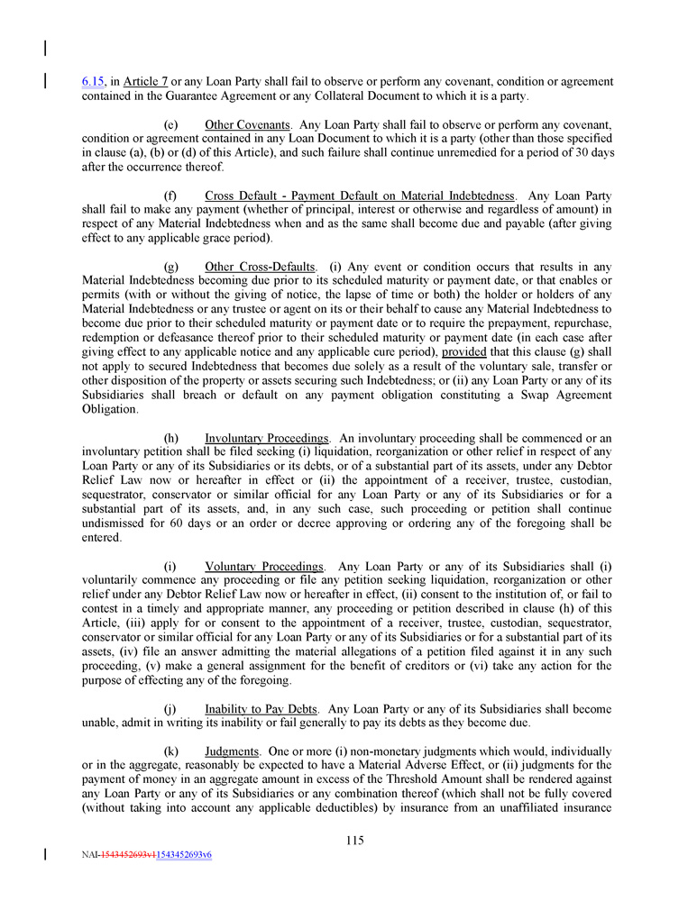 6.15 , in Article 7 or any Loan Party shall fail to observe or perform any covenant, condition or agreement contained in the Guarantee Agreement or any Collateral Document to which it is a party. (e) Other Covenants . Any Loan Party shall fail to observe or perform any covenant, condition or agreement contained in any Loan Document to which it is a party (other than those specified in clause (a), (b) or (d) of this Article), and such failure shall continue unremedied for a period of 30 days after the occurrence thereof . (f) Cross Default - Payment Default on Material Indebtedness . Any Loan Party shall fail to make any payment (whether of principal, interest or otherwise and regardless of amount) in respect of any Material Indebtedness when and as the same shall become due and payable (after giving effect to any applicable grace period) . (g) Other Cross - Defaults . (i) Any event or condition occurs that results in any Material Indebtedness becoming due prior to its scheduled maturity or payment date, or that enables or permits (with or without the giving of notice, the lapse of time or both) the holder or holders of any Material Indebtedness or any trustee or agent on its or their behalf to cause any Material Indebtedness to become due prior to their scheduled maturity or payment date or to require the prepayment, repurchase, redemption or defeasance thereof prior to their scheduled maturity or payment date (in each case after giving effect to any applicable notice and any applicable cure period), provided that this clause (g) shall not apply to secured Indebtedness that becomes due solely as a result of the voluntary sale, transfer or other disposition of the property or assets securing such Indebtedness ; or (ii) any Loan Party or any of its Subsidiaries shall breach or default on any payment obligation constituting a Swap Agreement Obligation . (h) Involuntary Proceedings . An involuntary proceeding shall be commenced or an involuntary petition shall be filed seeking (i) liquidation, reorganization or other relief in respect of any Loan Party or any of its Subsidiaries or its debts, or of a substantial part of its assets, under any Debtor Relief Law now or hereafter in effect or (ii) the appointment of a receiver, trustee, custodian, sequestrator, conservator or similar official for any Loan Party or any of its Subsidiaries or for a substantial part of its assets, and, in any such case, such proceeding or petition shall continue undismissed for 60 days or an order or decree approving or ordering any of the foregoing shall be entered . (i) Voluntary Proceedings . Any Loan Party or any of its Subsidiaries shall (i) voluntarily commence any proceeding or file any petition seeking liquidation, reorganization or other relief under any Debtor Relief Law now or hereafter in effect, (ii) consent to the institution of, or fail to contest in a timely and appropriate manner, any proceeding or petition described in clause (h) of this Article, (iii) apply for or consent to the appointment of a receiver, trustee, custodian, sequestrator, conservator or similar official for any Loan Party or any of its Subsidiaries or for a substantial part of its assets, (iv) file an answer admitting the material allegations of a petition filed against it in any such proceeding, (v) make a general assignment for the benefit of creditors or (vi) take any action for the purpose of effecting any of the foregoing . (j) Inability to Pay Debts . Any Loan Party or any of its Subsidiaries shall become unable, admit in writing its inability or fail generally to pay its debts as they become due . (k) Judgments . One or more (i) non - monetary judgments which would, individually or in the aggregate, reasonably be expected to have a Material Adverse Effect, or (ii) judgments for the payment of money in an aggregate amount in excess of the Threshold Amount shall be rendered against any Loan Party or any of its Subsidiaries or any combination thereof (which shall not be fully covered (without taking into account any applicable deductibles) by insurance from an unaffiliated insurance 115 NAI - 1543452693v1 1543452693v6
