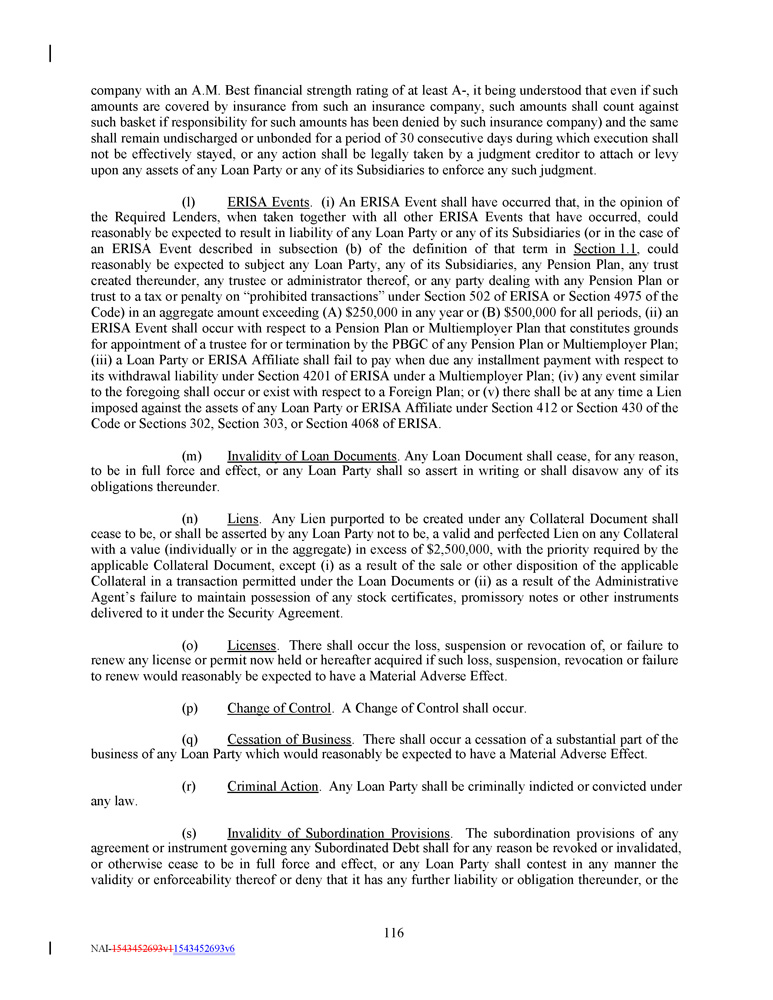 company with an A . M . Best financial strength rating of at least A - , it being understood that even if such amounts are covered by insurance from such an insurance company, such amounts shall count against such basket if responsibility for such amounts has been denied by such insurance company) and the same shall remain undischarged or unbonded for a period of 30 consecutive days during which execution shall not be effectively stayed, or any action shall be legally taken by a judgment creditor to attach or levy upon any assets of any Loan Party or any of its Subsidiaries to enforce any such judgment . (l) ERISA Events . (i) An ERISA Event shall have occurred that, in the opinion of the Required Lenders, when taken together with all other ERISA Events that have occurred, could reasonably be expected to result in liability of any Loan Party or any of its Subsidiaries (or in the case of an ERISA Event described in subsection (b) of the definition of that term in Section 1 . 1 , could reasonably be expected to subject any Loan Party, any of its Subsidiaries, any Pension Plan, any trust created thereunder, any trustee or administrator thereof, or any party dealing with any Pension Plan or trust to a tax or penalty on “prohibited transactions” under Section 502 of ERISA or Section 4975 of the Code) in an aggregate amount exceeding (A) $ 250 , 000 in any year or (B) $ 500 , 000 for all periods, (ii) an ERISA Event shall occur with respect to a Pension Plan or Multiemployer Plan that constitutes grounds for appointment of a trustee for or termination by the PBGC of any Pension Plan or Multiemployer Plan ; (iii) a Loan Party or ERISA Affiliate shall fail to pay when due any installment payment with respect to its withdrawal liability under Section 4201 of ERISA under a Multiemployer Plan ; (iv) any event similar to the foregoing shall occur or exist with respect to a Foreign Plan ; or (v) there shall be at any time a Lien imposed against the assets of any Loan Party or ERISA Affiliate under Section 412 or Section 430 of the Code or Sections 302 , Section 303 , or Section 4068 of ERISA . (m) Invalidity of Loan Documents . Any Loan Document shall cease, for any reason, to be in full force and effect, or any Loan Party shall so assert in writing or shall disavow any of its obligations thereunder . (n) Liens . Any Lien purported to be created under any Collateral Document shall cease to be, or shall be asserted by any Loan Party not to be, a valid and perfected Lien on any Collateral with a value (individually or in the aggregate) in excess of $ 2 , 500 , 000 , with the priority required by the applicable Collateral Document, except (i) as a result of the sale or other disposition of the applicable Collateral in a transaction permitted under the Loan Documents or (ii) as a result of the Administrative Agent’s failure to maintain possession of any stock certificates, promissory notes or other instruments delivered to it under the Security Agreement . (o) Licenses . There shall occur the loss, suspension or revocation of, or failure to renew any license or permit now held or hereafter acquired if such loss, suspension, revocation or failure to renew would reasonably be expected to have a Material Adverse Effect . (p) Change of Control . A Change of Control shall occur. (q) Cessation of Business . There shall occur a cessation of a substantial part of the business of any Loan Party which would reasonably be expected to have a Material Adverse Effect . (r) Criminal Action . Any Loan Party shall be criminally indicted or convicted under any law . (s) Invalidity of Subordination Provisions . The subordination provisions of any agreement or instrument governing any Subordinated Debt shall for any reason be revoked or invalidated, or otherwise cease to be in full force and effect, or any Loan Party shall contest in any manner the validity or enforceability thereof or deny that it has any further liability or obligation thereunder, or the 116 NAI - 1543452693v1 1543452693v6