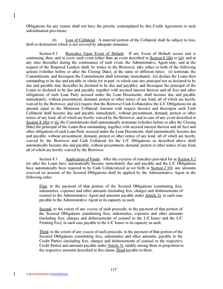 Obligations for any reason shall not have the priority contemplated by this Credit Agreement or such subordination provisions. (t) Loss of Collateral . A material portion of the Collateral shall be subject to loss, theft or destruction which is not covered by adequate insurance. Section 8 . 2 Remedies Upon Event of Default . If any Event of Default occurs and is continuing, then, and in every such event (other than an event described in Section 8 . 1 (h) or (i) ), and at any time thereafter during the continuance of such event, the Administrative Agent may, and at the request of the Required Lenders shall, by notice to the Borrower, take either or both of the following actions (whether before or after the Closing Date), at the same or different times : (i) terminate the Commitments, and thereupon the Commitments shall terminate immediately, (ii) declare the Loans then outstanding to be due and payable in whole (or in part, in which case any principal not so declared to be due and payable may thereafter be declared to be due and payable), and thereupon the principal of the Loans so declared to be due and payable, together with accrued interest thereon and all fees and other obligations of each Loan Party accrued under the Loan Documents, shall become due and payable immediately, without presentment, demand, protest or other notice of any kind, all of which are hereby waived by the Borrower, and (iii) require that the Borrower Cash Collateralize the L/C Obligations (in an amount equal to the Minimum Collateral Amount with respect thereto) and thereupon such Cash Collateral shall become due and payable immediately, without presentment, demand, protest or other notice of any kind, all of which are hereby waived by the Borrower, and in case of any event described in Section 8 . 1 (h) or (i) , the Commitments shall automatically terminate (whether before or after the Closing Date) the principal of the Loans then outstanding, together with accrued interest thereon and all fees and other obligations of each Loan Party accrued under the Loan Documents, shall automatically become due and payable, without presentment, demand, protest or other notice of any kind, all of which are hereby waived by the Borrower and Cash Collateral for the L/C Obligations as described above shall automatically become due and payable, without presentment, demand, protest or other notice of any kind, all of which are hereby waived by the Borrower . Section 8 . 3 Application of Funds . After the exercise of remedies provided for in Section 8 . 2 (or after the Loans have automatically become immediately due and payable and the L/C Obligations have automatically been required to be Cash Collateralized as set forth in Section 2 . 10 ), any amounts received on account of the Secured Obligations shall be applied by the Administrative Agent in the following order : First , to the payment of that portion of the Secured Obligations constituting fees, indemnities, expenses and other amounts (including fees, charges and disbursements of counsel to the Administrative Agent and amounts payable under Article 3 ) , in each case payable to the Administrative Agent in its capacity as such ; Second , to the extent of any excess of such proceeds, to the payment of that portion of the Secured Obligations constituting fees, indemnities, expenses and other amounts (including fees, charges and disbursements of counsel to the L/C Issuer and the L/C Fronting Fee), in each case payable to the L/C Issuer in its capacity as such ; Third , to the extent of any excess of such proceeds, to the payment of that portion of the Secured Obligations constituting fees, indemnities and other amounts, payable to the Credit Parties (including fees, charges and disbursements of counsel to the respective Credit Parties and amounts payable under Article 3 ) , ratably among them in proportion to the respective amounts described in this clause Third payable to them ; 117 NAI - 1543452693v1 1543452693v6