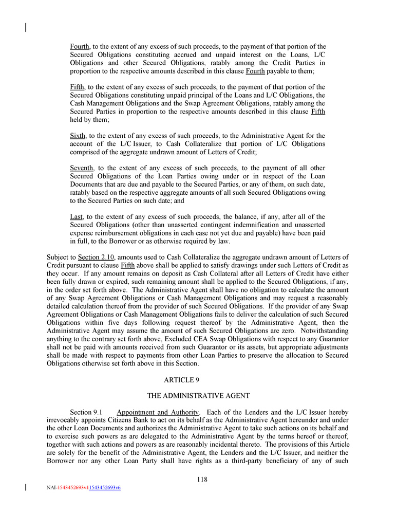 Fourth , to the extent of any excess of such proceeds, to the payment of that portion of the Secured Obligations constituting accrued and unpaid interest on the Loans, L/C Obligations and other Secured Obligations, ratably among the Credit Parties in proportion to the respective amounts described in this clause Fourth payable to them ; Fifth , to the extent of any excess of such proceeds, to the payment of that portion of the Secured Obligations constituting unpaid principal of the Loans and L/C Obligations, the Cash Management Obligations and the Swap Agreement Obligations, ratably among the Secured Parties in proportion to the respective amounts described in this clause Fifth held by them ; Sixth , to the extent of any excess of such proceeds, to the Administrative Agent for the account of the L/C Issuer, to Cash Collateralize that portion of L/C Obligations comprised of the aggregate undrawn amount of Letters of Credit ; Seventh , to the extent of any excess of such proceeds, to the payment of all other Secured Obligations of the Loan Parties owing under or in respect of the Loan Documents that are due and payable to the Secured Parties, or any of them, on such date, ratably based on the respective aggregate amounts of all such Secured Obligations owing to the Secured Parties on such date ; and Last , to the extent of any excess of such proceeds, the balance, if any, after all of the Secured Obligations (other than unasserted contingent indemnification and unasserted expense reimbursement obligations in each case not yet due and payable) have been paid in full, to the Borrower or as otherwise required by law . Subject to Section 2 . 10 , amounts used to Cash Collateralize the aggregate undrawn amount of Letters of Credit pursuant to clause Fifth above shall be applied to satisfy drawings under such Letters of Credit as they occur . If any amount remains on deposit as Cash Collateral after all Letters of Credit have either been fully drawn or expired, such remaining amount shall be applied to the Secured Obligations, if any, in the order set forth above . The Administrative Agent shall have no obligation to calculate the amount of any Swap Agreement Obligations or Cash Management Obligations and may request a reasonably detailed calculation thereof from the provider of such Secured Obligations . If the provider of any Swap Agreement Obligations or Cash Management Obligations fails to deliver the calculation of such Secured Obligations within five days following request thereof by the Administrative Agent, then the Administrative Agent may assume the amount of such Secured Obligations are zero . Notwithstanding anything to the contrary set forth above, Excluded CEA Swap Obligations with respect to any Guarantor shall not be paid with amounts received from such Guarantor or its assets, but appropriate adjustments shall be made with respect to payments from other Loan Parties to preserve the allocation to Secured Obligations otherwise set forth above in this Section . ARTICLE 9 THE ADMINISTRATIVE AGENT Section 9 . 1 Appointment and Authority . Each of the Lenders and the L/C Issuer hereby irrevocably appoints Citizens Bank to act on its behalf as the Administrative Agent hereunder and under the other Loan Documents and authorizes the Administrative Agent to take such actions on its behalf and to exercise such powers as are delegated to the Administrative Agent by the terms hereof or thereof, together with such actions and powers as are reasonably incidental thereto . The provisions of this Article are solely for the benefit of the Administrative Agent, the Lenders and the L/C Issuer, and neither the Borrower nor any other Loan Party shall have rights as a third - party beneficiary of any of such 118 NAI - 1543452693v1 1543452693v6