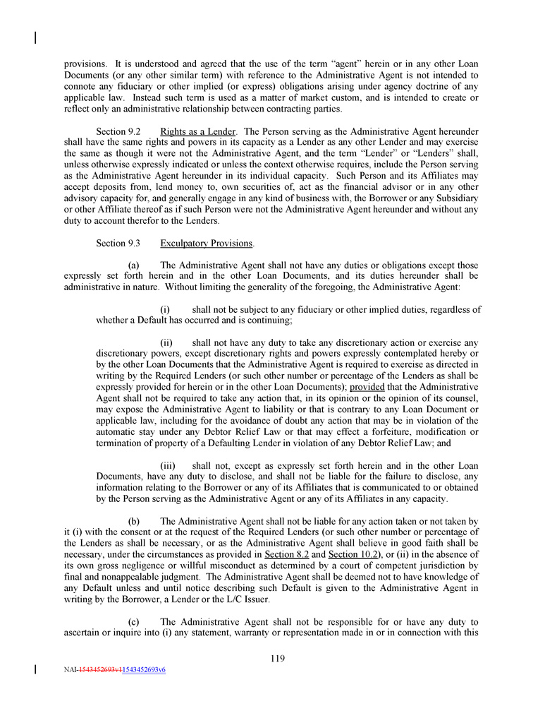 provisions . It is understood and agreed that the use of the term “agent” herein or in any other Loan Documents (or any other similar term) with reference to the Administrative Agent is not intended to connote any fiduciary or other implied (or express) obligations arising under agency doctrine of any applicable law . Instead such term is used as a matter of market custom, and is intended to create or reflect only an administrative relationship between contracting parties . Section 9 . 2 Rights as a Lender . The Person serving as the Administrative Agent hereunder shall have the same rights and powers in its capacity as a Lender as any other Lender and may exercise the same as though it were not the Administrative Agent, and the term “Lender” or “Lenders” shall, unless otherwise expressly indicated or unless the context otherwise requires, include the Person serving as the Administrative Agent hereunder in its individual capacity . Such Person and its Affiliates may accept deposits from, lend money to, own securities of, act as the financial advisor or in any other advisory capacity for, and generally engage in any kind of business with, the Borrower or any Subsidiary or other Affiliate thereof as if such Person were not the Administrative Agent hereunder and without any duty to account therefor to the Lenders . Section 9.3 Exculpatory Provisions . (a) The Administrative Agent shall not have any duties or obligations except those expressly set forth herein and in the other Loan Documents, and its duties hereunder shall be administrative in nature . Without limiting the generality of the foregoing, the Administrative Agent : (i) shall not be subject to any fiduciary or other implied duties, regardless of whether a Default has occurred and is continuing ; (ii) shall not have any duty to take any discretionary action or exercise any discretionary powers, except discretionary rights and powers expressly contemplated hereby or by the other Loan Documents that the Administrative Agent is required to exercise as directed in writing by the Required Lenders (or such other number or percentage of the Lenders as shall be expressly provided for herein or in the other Loan Documents) ; provided that the Administrative Agent shall not be required to take any action that, in its opinion or the opinion of its counsel, may expose the Administrative Agent to liability or that is contrary to any Loan Document or applicable law, including for the avoidance of doubt any action that may be in violation of the automatic stay under any Debtor Relief Law or that may effect a forfeiture, modification or termination of property of a Defaulting Lender in violation of any Debtor Relief Law ; and (iii) shall not, except as expressly set forth herein and in the other Loan Documents, have any duty to disclose, and shall not be liable for the failure to disclose, any information relating to the Borrower or any of its Affiliates that is communicated to or obtained by the Person serving as the Administrative Agent or any of its Affiliates in any capacity . (b) The Administrative Agent shall not be liable for any action taken or not taken by it (i) with the consent or at the request of the Required Lenders (or such other number or percentage of the Lenders as shall be necessary, or as the Administrative Agent shall believe in good faith shall be necessary, under the circumstances as provided in Section 8 . 2 and Section 10 . 2 ), or (ii) in the absence of its own gross negligence or willful misconduct as determined by a court of competent jurisdiction by final and nonappealable judgment . The Administrative Agent shall be deemed not to have knowledge of any Default unless and until notice describing such Default is given to the Administrative Agent in writing by the Borrower, a Lender or the L/C Issuer . (c) The Administrative Agent shall not be responsible for or have any duty to ascertain or inquire into (i) any statement, warranty or representation made in or in connection with this 119 NAI - 1543452693v1 1543452693v6