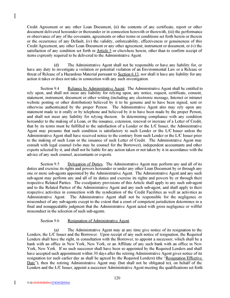 Credit Agreement or any other Loan Document, (ii) the contents of any certificate, report or other document delivered hereunder or thereunder or in connection herewith or therewith, (iii) the performance or observance of any of the covenants, agreements or other terms or conditions set forth herein or therein or the occurrence of any Default, (iv) the validity, enforceability, effectiveness or genuineness of this Credit Agreement, any other Loan Document or any other agreement, instrument or document, or (v) the satisfaction of any condition set forth in Article 5 or elsewhere herein, other than to confirm receipt of items expressly required to be delivered to the Administrative Agent . (d) The Administrative Agent shall not be responsible or have any liability for, or have any duty to investigate a violation or potential violation of an Environmental Law or a Release or threat of Release of a Hazardous Material pursuant to Section 6 . 13 , nor shall it have any liability for any action it takes or does not take in connection with any such investigation . Section 9 . 4 Reliance by Administrative Agent . The Administrative Agent shall be entitled to rely upon, and shall not incur any liability for relying upon, any notice, request, certificate, consent, statement, instrument, document or other writing (including any electronic message, Internet or intranet website posting or other distribution) believed by it to be genuine and to have been signed, sent or otherwise authenticated by the proper Person . The Administrative Agent also may rely upon any statement made to it orally or by telephone and believed by it to have been made by the proper Person, and shall not incur any liability for relying thereon . In determining compliance with any condition hereunder to the making of a Loan, or the issuance, extension, renewal or increase of a Letter of Credit, that by its terms must be fulfilled to the satisfaction of a Lender or the L/C Issuer, the Administrative Agent may presume that such condition is satisfactory to such Lender or the L/C Issuer unless the Administrative Agent shall have received notice to the contrary from such Lender or the L/C Issuer prior to the making of such Loan or the issuance of such Letter of Credit . The Administrative Agent may consult with legal counsel (who may be counsel for the Borrower), independent accountants and other experts selected by it, and shall not be liable for any action taken or not taken by it in accordance with the advice of any such counsel, accountants or experts . Section 9 . 5 Delegation of Duties . The Administrative Agent may perform any and all of its duties and exercise its rights and powers hereunder or under any other Loan Document by or through any one or more sub - agents appointed by the Administrative Agent . The Administrative Agent and any such sub - agent may perform any and all of its duties and exercise its rights and powers by or through their respective Related Parties . The exculpatory provisions of this Article shall apply to any such sub - agent and to the Related Parties of the Administrative Agent and any such sub - agent, and shall apply to their respective activities in connection with the syndication of the Credit Facilities as well as activities as Administrative Agent . The Administrative Agent shall not be responsible for the negligence or misconduct of any sub - agents except to the extent that a court of competent jurisdiction determines in a final and nonappealable judgment that the Administrative Agent acted with gross negligence or willful misconduct in the selection of such sub - agents . Section 9.6 Resignation of Administrative Agent . (a) The Administrative Agent may at any time give notice of its resignation to the Lenders, the L/C Issuer and the Borrower . Upon receipt of any such notice of resignation, the Required Lenders shall have the right, in consultation with the Borrower, to appoint a successor, which shall be a bank with an office in New York, New York, or an Affiliate of any such bank with an office in New York, New York . If no such successor shall have been so appointed by the Required Lenders and shall have accepted such appointment within 30 days after the retiring Administrative Agent gives notice of its resignation (or such earlier day as shall be agreed by the Required Lenders) (the “ Resignation Effective Date ”), then the retiring Administrative Agent may (but shall not be obligated to), on behalf of the Lenders and the L/C Issuer, appoint a successor Administrative Agent meeting the qualifications set forth 120 NAI - 1543452693v1 1543452693v6