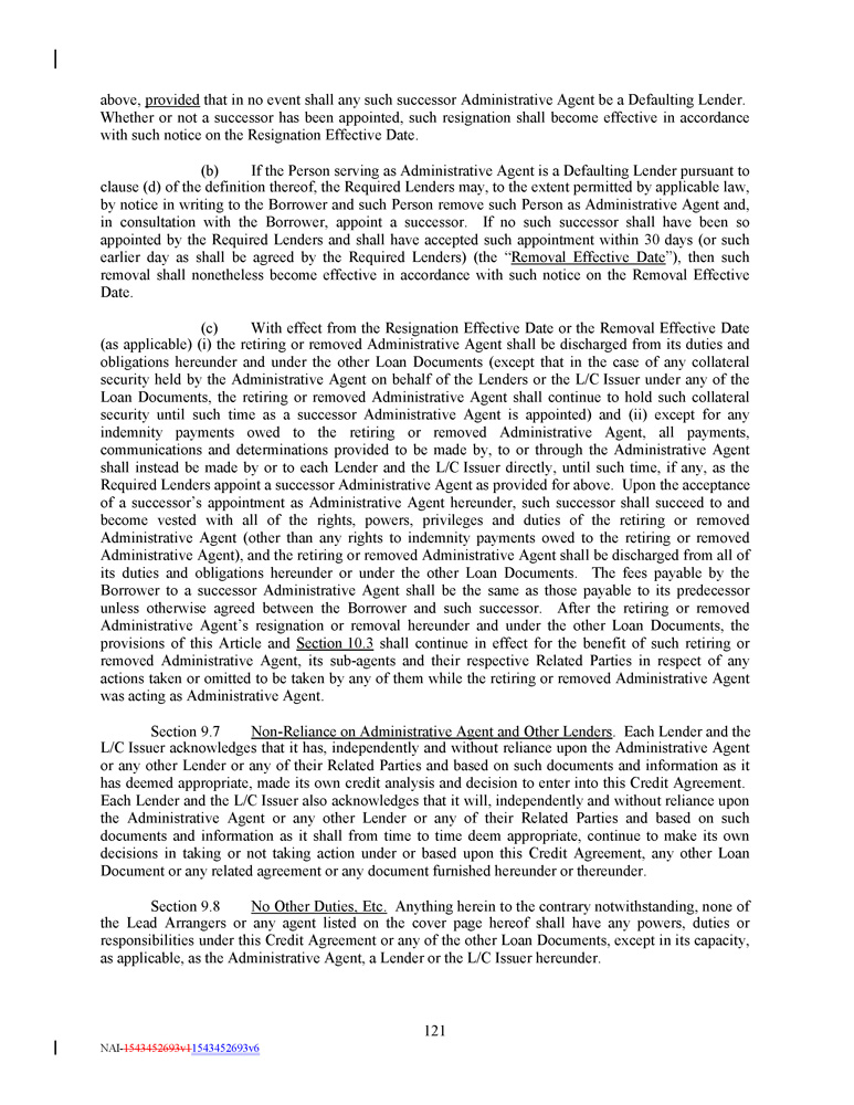 above, provided that in no event shall any such successor Administrative Agent be a Defaulting Lender . Whether or not a successor has been appointed, such resignation shall become effective in accordance with such notice on the Resignation Effective Date . (b) If the Person serving as Administrative Agent is a Defaulting Lender pursuant to clause (d) of the definition thereof, the Required Lenders may, to the extent permitted by applicable law, by notice in writing to the Borrower and such Person remove such Person as Administrative Agent and, in consultation with the Borrower, appoint a successor . If no such successor shall have been so appointed by the Required Lenders and shall have accepted such appointment within 30 days (or such earlier day as shall be agreed by the Required Lenders) (the “ Removal Effective Date ”), then such removal shall nonetheless become effective in accordance with such notice on the Removal Effective Date . (c) With effect from the Resignation Effective Date or the Removal Effective Date (as applicable) (i) the retiring or removed Administrative Agent shall be discharged from its duties and obligations hereunder and under the other Loan Documents (except that in the case of any collateral security held by the Administrative Agent on behalf of the Lenders or the L/C Issuer under any of the Loan Documents, the retiring or removed Administrative Agent shall continue to hold such collateral security until such time as a successor Administrative Agent is appointed) and (ii) except for any indemnity payments owed to the retiring or removed Administrative Agent, all payments, communications and determinations provided to be made by, to or through the Administrative Agent shall instead be made by or to each Lender and the L/C Issuer directly, until such time, if any, as the Required Lenders appoint a successor Administrative Agent as provided for above . Upon the acceptance of a successor’s appointment as Administrative Agent hereunder, such successor shall succeed to and become vested with all of the rights, powers, privileges and duties of the retiring or removed Administrative Agent (other than any rights to indemnity payments owed to the retiring or removed Administrative Agent), and the retiring or removed Administrative Agent shall be discharged from all of its duties and obligations hereunder or under the other Loan Documents . The fees payable by the Borrower to a successor Administrative Agent shall be the same as those payable to its predecessor unless otherwise agreed between the Borrower and such successor . After the retiring or removed Administrative Agent’s resignation or removal hereunder and under the other Loan Documents, the provisions of this Article and Section 10 . 3 shall continue in effect for the benefit of such retiring or removed Administrative Agent, its sub - agents and their respective Related Parties in respect of any actions taken or omitted to be taken by any of them while the retiring or removed Administrative Agent was acting as Administrative Agent . Section 9.7 Non - Reliance on Administrative Agent and Other Lenders . Each Lender and the L/C Issuer acknowledges that it has, independently and without reliance upon the Administrative Agent or any other Lender or any of their Related Parties and based on such documents and information as it has deemed appropriate, made its own credit analysis and decision to enter into this Credit Agreement. Each Lender and the L/C Issuer also acknowledges that it will, independently and without reliance upon the Administrative Agent or any other Lender or any of their Related Parties and based on such documents and information as it shall from time to time deem appropriate, continue to make its own decisions in taking or not taking action under or based upon this Credit Agreement, any other Loan Document or any related agreement or any document furnished hereunder or thereunder. Section 9 . 8 No Other Duties, Etc . Anything herein to the contrary notwithstanding, none of the Lead Arrangers or any agent listed on the cover page hereof shall have any powers, duties or responsibilities under this Credit Agreement or any of the other Loan Documents, except in its capacity, as applicable, as the Administrative Agent, a Lender or the L/C Issuer hereunder . 121 NAI - 1543452693v1 1543452693v6