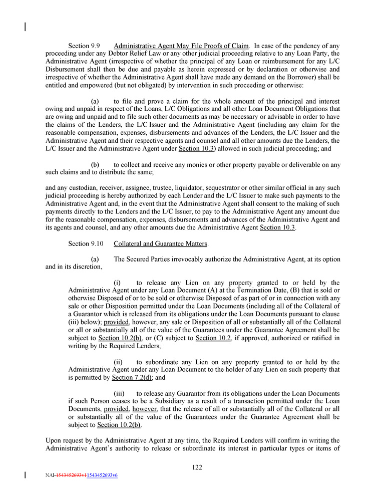 Section 9 . 9 Administrative Agent May File Proofs of Claim . In case of the pendency of any proceeding under any Debtor Relief Law or any other judicial proceeding relative to any Loan Party, the Administrative Agent (irrespective of whether the principal of any Loan or reimbursement for any L/C Disbursement shall then be due and payable as herein expressed or by declaration or otherwise and irrespective of whether the Administrative Agent shall have made any demand on the Borrower) shall be entitled and empowered (but not obligated) by intervention in such proceeding or otherwise : (a) to file and prove a claim for the whole amount of the principal and interest owing and unpaid in respect of the Loans, L/C Obligations and all other Loan Document Obligations that are owing and unpaid and to file such other documents as may be necessary or advisable in order to have the claims of the Lenders, the L/C Issuer and the Administrative Agent (including any claim for the reasonable compensation, expenses, disbursements and advances of the Lenders, the L/C Issuer and the Administrative Agent and their respective agents and counsel and all other amounts due the Lenders, the L/C Issuer and the Administrative Agent under Section 10 . 3 ) allowed in such judicial proceeding ; and (b) to collect and receive any monies or other property payable or deliverable on any such claims and to distribute the same ; and any custodian, receiver, assignee, trustee, liquidator, sequestrator or other similar official in any such judicial proceeding is hereby authorized by each Lender and the L/C Issuer to make such payments to the Administrative Agent and, in the event that the Administrative Agent shall consent to the making of such payments directly to the Lenders and the L/C Issuer, to pay to the Administrative Agent any amount due for the reasonable compensation, expenses, disbursements and advances of the Administrative Agent and its agents and counsel, and any other amounts due the Administrative Agent Section 10 . 3 . Section 9.10 Collateral and Guarantee Matters . (a) The Secured Parties irrevocably authorize the Administrative Agent, at its option and in its discretion, (i) to release any Lien on any property granted to or held by the Administrative Agent under any Loan Document (A) at the Termination Date, (B) that is sold or otherwise Disposed of or to be sold or otherwise Disposed of as part of or in connection with any sale or other Disposition permitted under the Loan Documents (including all of the Collateral of a Guarantor which is released from its obligations under the Loan Documents pursuant to clause (iii) below) ; provided , however, any sale or Disposition of all or substantially all of the Collateral or all or substantially all of the value of the Guarantees under the Guarantee Agreement shall be subject to Section 10 . 2 (b) , or (C) subject to Section 10 . 2 , if approved, authorized or ratified in writing by the Required Lenders ; (ii) to subordinate any Lien on any property granted to or held by the Administrative Agent under any Loan Document to the holder of any Lien on such property that is permitted by Section 7 . 2 (d) ; and (iii) to release any Guarantor from its obligations under the Loan Documents if such Person ceases to be a Subsidiary as a result of a transaction permitted under the Loan Documents, provided , however , that the release of all or substantially all of the Collateral or all or substantially all of the value of the Guarantees under the Guarantee Agreement shall be subject to Section 10 . 2 (b) . Upon request by the Administrative Agent at any time, the Required Lenders will confirm in writing the Administrative Agent’s authority to release or subordinate its interest in particular types or items of 122 NAI - 1543452693v1 1543452693v6