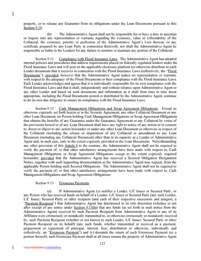 property, or to release any Guarantor from its obligations under the Loan Documents pursuant to this Section 9.10 . (b) The Administrative Agent shall not be responsible for or have a duty to ascertain or inquire into any representation or warranty regarding the existence, value or collectability of the Collateral, the existence, priority or perfection of the Administrative Agent’s Lien thereon, or any certificate prepared by any Loan Party in connection therewith, nor shall the Administrative Agent be responsible or liable to the Lenders for any failure to monitor or maintain any portion of the Collateral . Section 9 . 11 Compliance with Flood Insurance Laws . The Administrative Agent has adopted internal policies and procedures that address requirements placed on federally regulated lenders under the Flood Insurance Laws and will post on the applicable electronic platform (or otherwise distribute to each Lender documents that it receives in connection with the Flood Insurance Laws (collectively, the “ Flood Documents ”) ; provided , however that the Administrative Agent makes no representation or warranty with respect to the adequacy of the Flood Documents or their compliance with the Flood Insurance Laws . Each Lender acknowledges and agrees that it is individually responsible for its own compliance with the Flood Insurance Laws and that it shall, independently and without reliance upon Administrative Agent or any other Lender and based on such documents and information as it shall from time to time deem appropriate, including the Flood Documents posted or distributed by the Administrative Agent, continue to do its own due diligence to ensure its compliance with the Flood Insurance Laws . Section 9 . 12 Cash Management Obligations and Swap Agreement Obligations . Except as otherwise expressly set forth herein or in the Security Agreement, any other Collateral Document or any other Loan Document, no Person holding Cash Management Obligations or Swap Agreement Obligations that obtains the benefits of any Guarantee under the Guarantee Agreement or any Collateral by virtue of the provisions hereof or of any Loan Document shall have any right to notice of any action or to consent to, direct or object to any action hereunder or under any other Loan Document or otherwise in respect of the Collateral (including the release or impairment of any Collateral or amendment to any Loan Document (including any Collateral Document) other than in its capacity as a Lender or Administrative Agent and, in such case, only to the extent expressly provided in the Loan Documents . Notwithstanding any other provision of this Article 9 to the contrary, the Administrative Agent shall not be required to verify the payment of, or that other satisfactory arrangements have been made with respect to, Cash Management Obligations or Swap Agreement Obligations except to the extent expressly required hereunder, provided that the Administrative Agent has received a Secured Obligation Designation Notice, together with such supporting documentation as the Administrative Agent may request, from the applicable Person holding such Secured Obligations . The Administrative Agent shall not be required to verify the payment of, or that other satisfactory arrangements have been made with respect to, Cash Management Obligations and Swap Agreement Obligations . Section 9.13 Erroneous Payments . (a) If Administrative Agent (x) notifies a Lender, L/C Issuer or Secured Party, or any Person who has received funds on behalf of a Lender, L/C Issuer or Secured Party (any such Lender, L/C Issuer, Secured Party or other recipient (and each of their respective successors and assigns), a “ Payment Recipient ”) that Administrative Agent has determined in its sole discretion (whether or not after receipt of any notice under Section 9 . 13 (b) ) that any funds (as set forth in such notice from the Administrative Agent) received by such Payment Recipient from Administrative Agent or any of its Affiliates were erroneously or mistakenly transmitted to, or otherwise erroneously or mistakenly received by, such Payment Recipient (whether or not known to such Lender, L/C Issuer, Secured Party or other Payment Recipient on its behalf) (any such funds, whether transmitted or received as a payment, prepayment or repayment of principal, interest, fees, distribution or otherwise, individually and collectively, an “ Erroneous Payment ”) and (y) demands the return of such Erroneous Payment (or a portion thereof), such Erroneous Payment shall at all times remain the property of Administrative Agent 123 NAI - 1543452693v1 1543452693v6