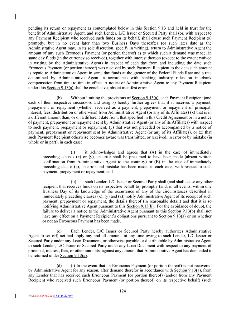 pending its return or repayment as contemplated below in this Section 9 . 13 and held in trust for the benefit of Administrative Agent, and such Lender, L/C Issuer or Secured Party shall (or, with respect to any Payment Recipient who received such funds on its behalf, shall cause such Payment Recipient to) promptly, but in no event later than two Business Days thereafter (or such later date as the Administrative Agent may, in its sole discretion, specify in writing), return to Administrative Agent the amount of any such Erroneous Payment (or portion thereof) as to which such a demand was made, in same day funds (in the currency so received), together with interest thereon (except to the extent waived in writing by the Administrative Agent) in respect of each day from and including the date such Erroneous Payment (or portion thereof) was received by such Payment Recipient to the date such amount is repaid to Administrative Agent in same day funds at the greater of the Federal Funds Rate and a rate determined by Administrative Agent in accordance with banking industry rules on interbank compensation from time to time in effect . A notice of Administrative Agent to any Payment Recipient under this Section 9 . 13 (a) shall be conclusive, absent manifest error . (b) Without limiting the provisions of Section 9 . 13 (a) , each Payment Recipient (and each of their respective successors and assigns) hereby further agrees that if it receives a payment, prepayment or repayment (whether received as a payment, prepayment or repayment of principal, interest, fees, distribution or otherwise) from Administrative Agent (or any of its Affiliates) (x) that is in a different amount than, or on a different date from, that specified in this Credit Agreement or in a notice of payment, prepayment or repayment sent by Administrative Agent (or any of its Affiliates) with respect to such payment, prepayment or repayment, (y) that was not preceded or accompanied by a notice of payment, prepayment or repayment sent by Administrative Agent (or any of its Affiliates), or (z) that such Payment Recipient otherwise becomes aware was transmitted, or received, in error or by mistake (in whole or in part), in each case : (i) it acknowledges and agrees that (A) in the case of immediately preceding clauses (x) or (y), an error shall be presumed to have been made (absent written confirmation from Administrative Agent to the contrary) or (B) in the case of immediately preceding clause (z), an error and mistake has been made, in each case, with respect to such payment, prepayment or repayment ; and (ii) such Lender, L/C Issuer or Secured Party shall (and shall cause any other recipient that receives funds on its respective behalf to) promptly (and, in all events, within one Business Day of its knowledge of the occurrence of any of the circumstances described in immediately preceding clauses (x), (y) and (z)) notify Administrative Agent of its receipt of such payment, prepayment or repayment, the details thereof (in reasonable detail) and that it is so notifying Administrative Agent pursuant to this Section 9 . 13 (b) . For the avoidance of doubt, the failure to deliver a notice to the Administrative Agent pursuant to this Section 9 . 13 (b) shall not have any effect on a Payment Recipient’s obligations pursuant to Section 9 . 13 (a) or on whether or not an Erroneous Payment has been made . (c) Each Lender, L/C Issuer or Secured Party hereby authorizes Administrative Agent to set off, net and apply any and all amounts at any time owing to such Lender, L/C Issuer or Secured Party under any Loan Document, or otherwise payable or distributable by Administrative Agent to such Lender, L/C Issuer or Secured Party under any Loan Document with respect to any payment of principal, interest, fees, or other amounts, against any amount that Administrative Agent has demanded to be returned under Section 9 . 13 (a) . (d) (i) In the event that an Erroneous Payment (or portion thereof) is not recovered by Administrative Agent for any reason, after demand therefor in accordance with Section 9 . 13 (a) , from any Lender that has received such Erroneous Payment (or portion thereof) (and/or from any Payment Recipient who received such Erroneous Payment (or portion thereof) on its respective behalf) (such 124 NAI - 1543452693v1 1543452693v6