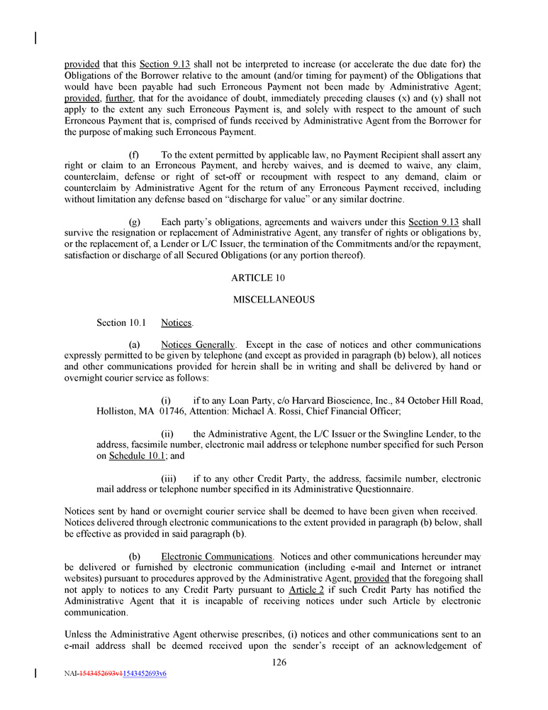 provided that this Section 9 . 13 shall not be interpreted to increase (or accelerate the due date for) the Obligations of the Borrower relative to the amount (and/or timing for payment) of the Obligations that would have been payable had such Erroneous Payment not been made by Administrative Agent ; provided , further , that for the avoidance of doubt, immediately preceding clauses (x) and (y) shall not apply to the extent any such Erroneous Payment is, and solely with respect to the amount of such Erroneous Payment that is, comprised of funds received by Administrative Agent from the Borrower for the purpose of making such Erroneous Payment . (f) To the extent permitted by applicable law, no Payment Recipient shall assert any right or claim to an Erroneous Payment, and hereby waives, and is deemed to waive, any claim, counterclaim, defense or right of set - off or recoupment with respect to any demand, claim or counterclaim by Administrative Agent for the return of any Erroneous Payment received, including without limitation any defense based on “discharge for value” or any similar doctrine . (g) Each party’s obligations, agreements and waivers under this Section 9 . 13 shall survive the resignation or replacement of Administrative Agent, any transfer of rights or obligations by, or the replacement of, a Lender or L/C Issuer, the termination of the Commitments and/or the repayment, satisfaction or discharge of all Secured Obligations (or any portion thereof) . ARTICLE 10 MISCELLANEOUS 126 NAI - 1543452693v1 1543452693v6 Section 10.1 Notices . (a) Notices Generally . Except in the case of notices and other communications expressly permitted to be given by telephone (and except as provided in paragraph (b) below), all notices and other communications provided for herein shall be in writing and shall be delivered by hand or overnight courier service as follows : (i) if to any Loan Party, c/o Harvard Bioscience, Inc . , 84 October Hill Road, Holliston, MA 01746 , Attention : Michael A . Rossi, Chief Financial Officer ; (ii) the Administrative Agent, the L/C Issuer or the Swingline Lender, to the address, facsimile number, electronic mail address or telephone number specified for such Person on Schedule 10 . 1 ; and (iii) if to any other Credit Party, the address, facsimile number, electronic mail address or telephone number specified in its Administrative Questionnaire . Notices sent by hand or overnight courier service shall be deemed to have been given when received. Notices delivered through electronic communications to the extent provided in paragraph (b) below, shall be effective as provided in said paragraph (b). (b) Electronic Communications . Notices and other communications hereunder may be delivered or furnished by electronic communication (including e - mail and Internet or intranet websites) pursuant to procedures approved by the Administrative Agent, provided that the foregoing shall not apply to notices to any Credit Party pursuant to Article 2 if such Credit Party has notified the Administrative Agent that it is incapable of receiving notices under such Article by electronic communication . Unless the Administrative Agent otherwise prescribes, (i) notices and other communications sent to an e - mail address shall be deemed received upon the sender’s receipt of an acknowledgement of