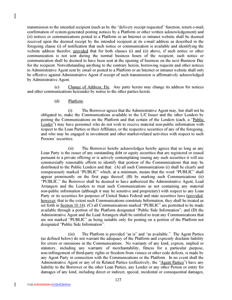 transmission to the intended recipient (such as by the “delivery receipt requested” function, return e - mail, confirmation of system - generated posting notices by a Platform or other written acknowledgement) and (ii) notices or communications posted to a Platform or an Internet or intranet website shall be deemed received upon the deemed receipt by the intended recipient at its e - mail address as described in the foregoing clause (i) of notification that such notice or communication is available and identifying the website address therefor ; provided that for both clauses (i) and (ii) above, if such notice or other communication is not sent during the normal business hours of the recipient, such notice or communication shall be deemed to have been sent at the opening of business on the next Business Day for the recipient . Notwithstanding anything to the contrary herein, borrowing requests and other notices to Administrative Agent sent by email or posted to a Platform or an Internet or intranet website shall only be effective against Administrative Agent if receipt of such transmission is affirmatively acknowledged by Administrative Agent . (c) Change of Address, Etc . Any party hereto may change its address for notices and other communications hereunder by notice to the other parties hereto. (d) Platform . (i) The Borrower agrees that the Administrative Agent may, but shall not be obligated to, make the Communications available to the L/C Issuer and the other Lenders by posting the Communications on the Platform and that certain of the Lenders (each, a “ Public Lender ”) may have personnel who do not wish to receive material non - public information with respect to the Loan Parties or their Affiliates, or the respective securities of any of the foregoing, and who may be engaged in investment and other market - related activities with respect to such Persons’ securities . (ii) The Borrower hereby acknowledges hereby agrees that so long as any Loan Party is the issuer of any outstanding debt or equity securities that are registered or issued pursuant to a private offering or is actively contemplating issuing any such securities it will use commercially reasonable efforts to identify that portion of the Communications that may be distributed to the Public Lenders and that : (A) all such Communications (i) shall be clearly and conspicuously marked “PUBLIC” which, at a minimum, means that the word “PUBLIC” shall appear prominently on the first page thereof ; (B) by marking such Communications (ii) “PUBLIC,” the Borrower shall be deemed to have authorized the Administrative Agent, Lead Arrangers and the Lenders to treat such Communications as not containing any material non - public information (although it may be sensitive and proprietary) with respect to any Loan Party or its securities for purposes of United States Federal and state securities laws ( provided , however , that to the extent such Communications constitute Information, they shall be treated as set forth in Section 10 . 14 ) ; (C) all Communications marked “PUBLIC” are permitted to be made available through a portion of the Platform designated “Public Side Information” ; and (D) the Administrative Agent and the Lead Arrangers shall be entitled to treat any Communications that are not marked “PUBLIC” as being suitable only for posting on a portion of the Platform not designated “Public Side Information” . (iii) The Platform is provided “as is” and “as available . ” The Agent Parties (as defined below) do not warrant the adequacy of the Platform and expressly disclaim liability for errors or omissions in the Communications . No warranty of any kind, express, implied or statutory, including any warranty of merchantability, fitness for a particular purpose, non - infringement of third - party rights or freedom from viruses or other code defects, is made by any Agent Party in connection with the Communications or the Platform . In no event shall the Administrative Agent or any of its Related Parties (collectively, the “ Agent Parties ”) have any liability to the Borrower or the other Loan Parties, any Lender or any other Person or entity for damages of any kind, including direct or indirect, special, incidental or consequential damages, 127 NAI - 1543452693v1 1543452693v6