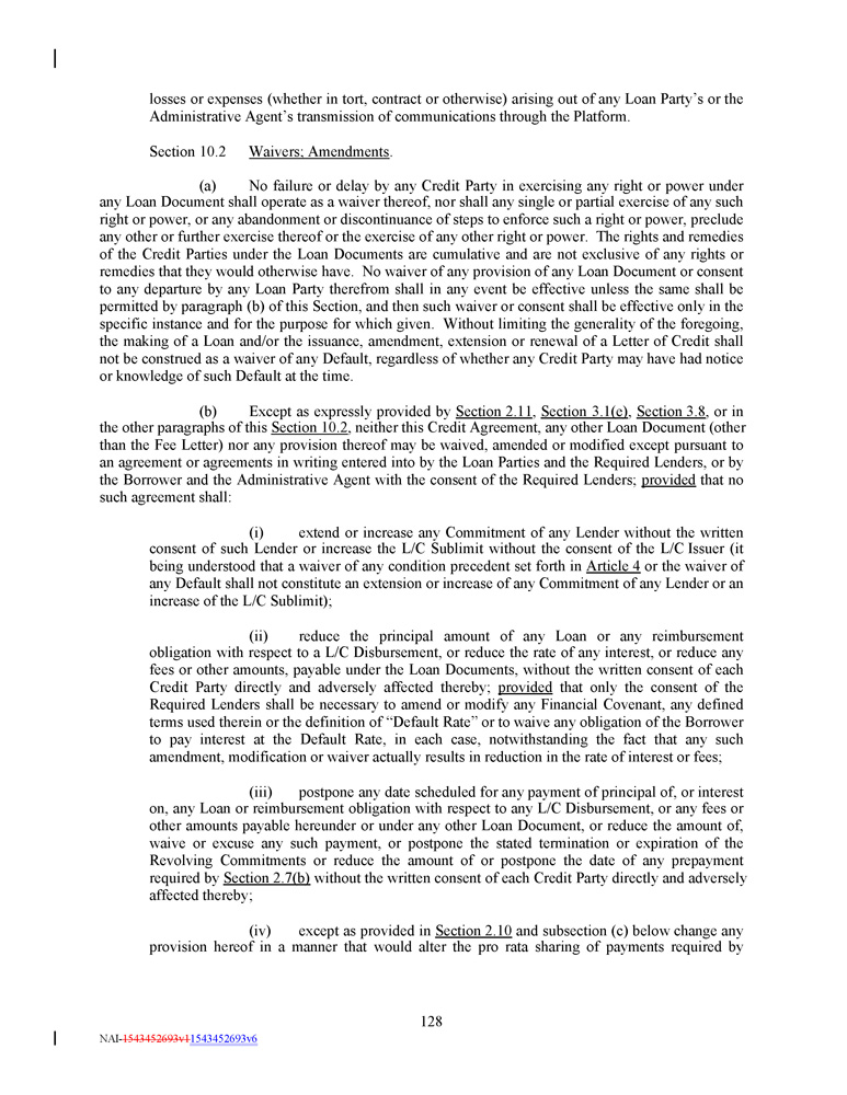losses or expenses (whether in tort, contract or otherwise) arising out of any Loan Party’s or the Administrative Agent’s transmission of communications through the Platform. Section 10.2 Waivers; Amendments . (a) No failure or delay by any Credit Party in exercising any right or power under any Loan Document shall operate as a waiver thereof, nor shall any single or partial exercise of any such right or power, or any abandonment or discontinuance of steps to enforce such a right or power, preclude any other or further exercise thereof or the exercise of any other right or power . The rights and remedies of the Credit Parties under the Loan Documents are cumulative and are not exclusive of any rights or remedies that they would otherwise have . No waiver of any provision of any Loan Document or consent to any departure by any Loan Party therefrom shall in any event be effective unless the same shall be permitted by paragraph (b) of this Section, and then such waiver or consent shall be effective only in the specific instance and for the purpose for which given . Without limiting the generality of the foregoing, the making of a Loan and/or the issuance, amendment, extension or renewal of a Letter of Credit shall not be construed as a waiver of any Default, regardless of whether any Credit Party may have had notice or knowledge of such Default at the time . (b) Except as expressly provided by Section 2 . 11 , Section 3 . 1 (e) , Section 3 . 8 , or in the other paragraphs of this Section 10 . 2 , neither this Credit Agreement, any other Loan Document (other than the Fee Letter) nor any provision thereof may be waived, amended or modified except pursuant to an agreement or agreements in writing entered into by the Loan Parties and the Required Lenders, or by the Borrower and the Administrative Agent with the consent of the Required Lenders ; provided that no such agreement shall : (i) extend or increase any Commitment of any Lender without the written consent of such Lender or increase the L/C Sublimit without the consent of the L/C Issuer (it being understood that a waiver of any condition precedent set forth in Article 4 or the waiver of any Default shall not constitute an extension or increase of any Commitment of any Lender or an increase of the L/C Sublimit) ; (ii) reduce the principal amount of any Loan or any reimbursement obligation with respect to a L/C Disbursement, or reduce the rate of any interest, or reduce any fees or other amounts, payable under the Loan Documents, without the written consent of each Credit Party directly and adversely affected thereby ; provided that only the consent of the Required Lenders shall be necessary to amend or modify any Financial Covenant, any defined terms used therein or the definition of “Default Rate” or to waive any obligation of the Borrower to pay interest at the Default Rate, in each case, notwithstanding the fact that any such amendment, modification or waiver actually results in reduction in the rate of interest or fees ; (iii) postpone any date scheduled for any payment of principal of, or interest on, any Loan or reimbursement obligation with respect to any L/C Disbursement, or any fees or other amounts payable hereunder or under any other Loan Document, or reduce the amount of, waive or excuse any such payment, or postpone the stated termination or expiration of the Revolving Commitments or reduce the amount of or postpone the date of any prepayment required by Section 2 . 7 (b) without the written consent of each Credit Party directly and adversely affected thereby ; (iv) except as provided in Section 2 . 10 and subsection (c) below change any provision hereof in a manner that would alter the pro rata sharing of payments required by 128 NAI - 1543452693v1 1543452693v6