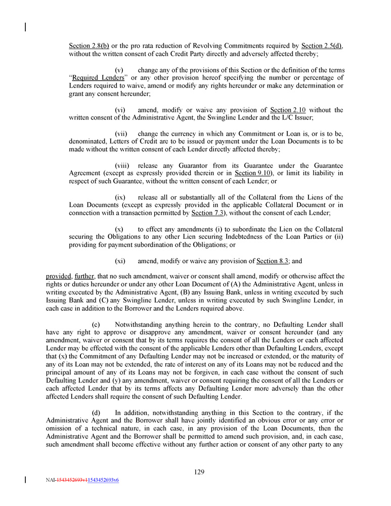 Section 2.8(b) or the pro rata reduction of Revolving Commitments required by Section 2.5(d) , without the written consent of each Credit Party directly and adversely affected thereby; (v) change any of the provisions of this Section or the definition of the terms “ Required Lenders ” or any other provision hereof specifying the number or percentage of Lenders required to waive, amend or modify any rights hereunder or make any determination or grant any consent hereunder ; (vi) amend, modify or waive any provision of Section 2 . 10 without the written consent of the Administrative Agent, the Swingline Lender and the L/C Issuer ; (vii) change the currency in which any Commitment or Loan is, or is to be, denominated, Letters of Credit are to be issued or payment under the Loan Documents is to be made without the written consent of each Lender directly affected thereby ; (viii) release any Guarantor from its Guarantee under the Guarantee Agreement (except as expressly provided therein or in Section 9 . 10 ), or limit its liability in respect of such Guarantee, without the written consent of each Lender ; or (ix) release all or substantially all of the Collateral from the Liens of the Loan Documents (except as expressly provided in the applicable Collateral Document or in connection with a transaction permitted by Section 7 . 3 ), without the consent of each Lender ; (x) to effect any amendments (i) to subordinate the Lien on the Collateral securing the Obligations to any other Lien securing Indebtedness of the Loan Parties or (ii) providing for payment subordination of the Obligations ; or (xi) amend, modify or waive any provision of Section 8.3 ; and provided , further , that no such amendment, waiver or consent shall amend, modify or otherwise affect the rights or duties hereunder or under any other Loan Document of (A) the Administrative Agent, unless in writing executed by the Administrative Agent, (B) any Issuing Bank, unless in writing executed by such Issuing Bank and (C) any Swingline Lender, unless in writing executed by such Swingline Lender, in each case in addition to the Borrower and the Lenders required above . (c) Notwithstanding anything herein to the contrary, no Defaulting Lender shall have any right to approve or disapprove any amendment, waiver or consent hereunder (and any amendment, waiver or consent that by its terms requires the consent of all the Lenders or each affected Lender may be effected with the consent of the applicable Lenders other than Defaulting Lenders, except that (x) the Commitment of any Defaulting Lender may not be increased or extended, or the maturity of any of its Loan may not be extended, the rate of interest on any of its Loans may not be reduced and the principal amount of any of its Loans may not be forgiven, in each case without the consent of such Defaulting Lender and (y) any amendment, waiver or consent requiring the consent of all the Lenders or each affected Lender that by its terms affects any Defaulting Lender more adversely than the other affected Lenders shall require the consent of such Defaulting Lender . (d) In addition, notwithstanding anything in this Section to the contrary, if the Administrative Agent and the Borrower shall have jointly identified an obvious error or any error or omission of a technical nature, in each case, in any provision of the Loan Documents, then the Administrative Agent and the Borrower shall be permitted to amend such provision, and, in each case, such amendment shall become effective without any further action or consent of any other party to any 129 NAI - 1543452693v1 1543452693v6