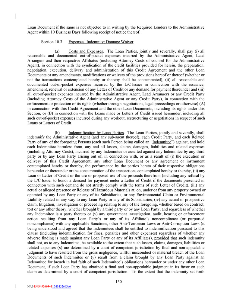 Loan Document if the same is not objected to in writing by the Required Lenders to the Administrative Agent within 10 Business Days following receipt of notice thereof. Section 10.3 Expenses; Indemnity; Damage Waiver . (a) Costs and Expenses . The Loan Parties, jointly and severally, shall pay (i) all reasonable and documented out - of - pocket expenses incurred by the Administrative Agent, Lead Arrangers and their respective Affiliates (including Attorney Costs of counsel for the Administrative Agent), in connection with the syndication of the credit facilities provided for herein, the preparation, negotiation, execution, delivery and administration of this Credit Agreement and the other Loan Documents or any amendments, modifications or waivers of the provisions hereof or thereof (whether or not the transactions contemplated hereby or thereby shall be consummated), (ii) all reasonable and documented out - of - pocket expenses incurred by the L/C Issuer in connection with the issuance, amendment, renewal or extension of any Letter of Credit or any demand for payment thereunder and (iii) all out - of - pocket expenses incurred by the Administrative Agent, Lead Arrangers or any Credit Party (including Attorney Costs of the Administrative Agent or any Credit Party), in connection with the enforcement or protection of its rights (whether through negotiations, legal proceedings or otherwise) (A) in connection with this Credit Agreement and the other Loan Documents, including its rights under this Section, or (B) in connection with the Loans made or Letters of Credit issued hereunder, including all such out - of - pocket expenses incurred during any workout, restructuring or negotiations in respect of such Loans or Letters of Credit . (b) Indemnification by Loan Parties . The Loan Parties, jointly and severally, shall indemnify the Administrative Agent (and any sub - agent thereof), each Credit Party, and each Related Party of any of the foregoing Persons (each such Person being called an “ Indemnitee ”) against, and hold each Indemnitee harmless from, any and all losses, claims, damages, liabilities and related expenses (including Attorney Costs), incurred by any Indemnitee or asserted against any Indemnitee by any third party or by any Loan Party arising out of, in connection with, or as a result of (i) the execution or delivery of this Credit Agreement, any other Loan Document or any agreement or instrument contemplated hereby or thereby, the performance by the parties hereto of their respective obligations hereunder or thereunder or the consummation of the transactions contemplated hereby or thereby, (ii) any Loan or Letter of Credit or the use or proposed use of the proceeds therefrom (including any refusal by the L/C Issuer to honor a demand for payment under a Letter of Credit if the documents presented in connection with such demand do not strictly comply with the terms of such Letter of Credit), (iii) any actual or alleged presence or Release of Hazardous Materials at, on, under or from any property owned or operated by any Loan Party or any of its Subsidiaries, or any Environmental Claim or Environmental Liability related in any way to any Loan Party or any of its Subsidiaries, (iv) any actual or prospective claim, litigation, investigation or proceeding relating to any of the foregoing, whether based on contract, tort or any other theory, whether brought by a third party or by any Loan Party, and regardless of whether any Indemnitee is a party thereto or (v) any government investigation, audit, hearing or enforcement action resulting from any Loan Party’s or any of its Affiliate’s noncompliance (or purported noncompliance) with any applicable Sanctions, other Anti - Terrorism Laws or Anti - Corruption Laws (it being understood and agreed that the Indemnitees shall be entitled to indemnification pursuant to this clause (including indemnification for fines, penalties and other expenses) regardless of whether any adverse finding is made against any Loan Party or any of its Affiliates), provided that such indemnity shall not, as to any Indemnitee, be available to the extent that such losses, claims, damages, liabilities or related expenses (x) are determined by a court of competent jurisdiction by final and non - appealable judgment to have resulted from the gross negligence, willful misconduct or material breach of the Loan Documents of such Indemnitee or (y) result from a claim brought by any Loan Party against an Indemnitee for breach in bad faith of such Indemnitee’s obligations hereunder or under any other Loan Document, if such Loan Party has obtained a final and non - appealable judgment in its favor on such claim as determined by a court of competent jurisdiction . To the extent that the indemnity set forth 130 NAI - 1543452693v1 1543452693v6