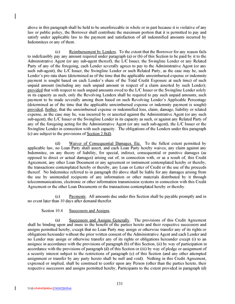 above in this paragraph shall be held to be unenforceable in whole or in part because it is violative of any law or public policy, the Borrower shall contribute the maximum portion that it is permitted to pay and satisfy under applicable law to the payment and satisfaction of all indemnified amounts incurred by Indemnitees or any of them . (c) Reimbursement by Lenders . To the extent that the Borrower for any reason fails to indefeasibly pay any amount required under paragraph (a) or (b) of this Section to be paid by it to the Administrative Agent (or any sub - agent thereof), the L/C Issuer, the Swingline Lender or any Related Party of any of the foregoing, each Lender severally agrees to pay to the Administrative Agent (or any such sub - agent), the L/C Issuer, the Swingline Lender or such Related Party, as the case may be, such Lender’s pro rata share (determined as of the time that the applicable unreimbursed expense or indemnity payment is sought based on each Lender’s share of the Total Credit Exposure at such time) of such unpaid amount (including any such unpaid amount in respect of a claim asserted by such Lender) ; provided that with respect to such unpaid amounts owed to the L/C Issuer or the Swingline Lender solely in its capacity as such, only the Revolving Lenders shall be required to pay such unpaid amounts, such payment to be made severally among them based on such Revolving Lender’s Applicable Percentage (determined as of the time that the applicable unreimbursed expense or indemnity payment is sought) provided , further , that the unreimbursed expense or indemnified loss, claim, damage, liability or related expense, as the case may be, was incurred by or asserted against the Administrative Agent (or any such sub - agent), the L/C Issuer or the Swingline Lender in its capacity as such, or against any Related Party of any of the foregoing acting for the Administrative Agent (or any such sub - agent), the L/C Issuer or the Swingline Lender in connection with such capacity . The obligations of the Lenders under this paragraph (c) are subject to the provisions of Section 2 . 8 (d) . (d) Waiver of Consequential Damages, Etc . To the fullest extent permitted by applicable law, no Loan Party shall assert, and each Loan Party hereby waives, any claim against any Indemnitee, on any theory of liability, for special, indirect, consequential or punitive damages (as opposed to direct or actual damages) arising out of, in connection with, or as a result of, this Credit Agreement, any other Loan Document or any agreement or instrument contemplated hereby or thereby, the transactions contemplated hereby or thereby, any Loan or Letter of Credit or the use of the proceeds thereof . No Indemnitee referred to in paragraph (b) above shall be liable for any damages arising from the use by unintended recipients of any information or other materials distributed by it through telecommunications, electronic or other information transmission systems in connection with this Credit Agreement or the other Loan Documents or the transactions contemplated hereby or thereby . (e) Payments . All amounts due under this Section shall be payable promptly and in no event later than 10 days after demand therefor . Section 10.4 Successors and Assigns . (a) Successors and Assigns Generally . The provisions of this Credit Agreement shall be binding upon and inure to the benefit of the parties hereto and their respective successors and assigns permitted hereby, except that no Loan Party may assign or otherwise transfer any of its rights or obligations hereunder without the prior written consent of the Administrative Agent and each Lender and no Lender may assign or otherwise transfer any of its rights or obligations hereunder except (i) to an assignee in accordance with the provisions of paragraph (b) of this Section, (ii) by way of participation in accordance with the provisions of paragraph (d) of this Section or (iii) by way of pledge or assignment of a security interest subject to the restrictions of paragraph (e) of this Section (and any other attempted assignment or transfer by any party hereto shall be null and void) . Nothing in this Credit Agreement, expressed or implied, shall be construed to confer upon any Person (other than the parties hereto, their respective successors and assigns permitted hereby, Participants to the extent provided in paragraph (d) 131 NAI - 1543452693v1 1543452693v6