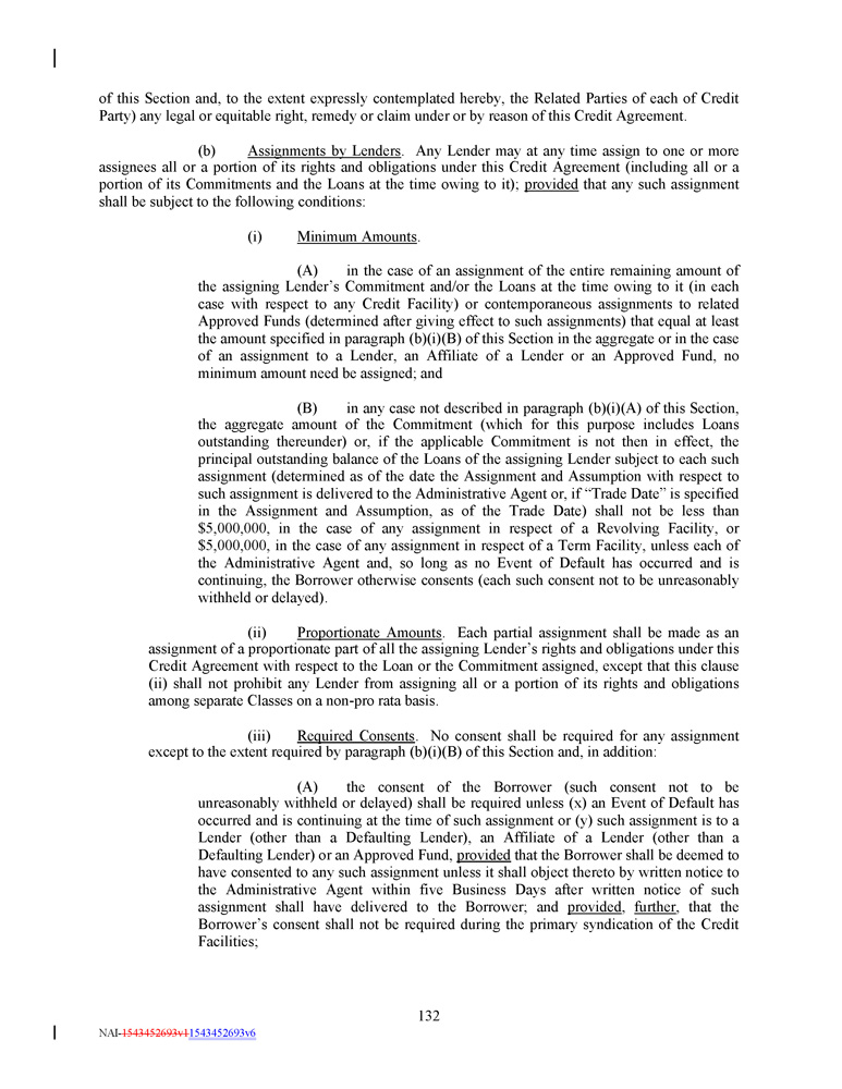 of this Section and, to the extent expressly contemplated hereby, the Related Parties of each of Credit Party) any legal or equitable right, remedy or claim under or by reason of this Credit Agreement. (b) Assignments by Lenders . Any Lender may at any time assign to one or more assignees all or a portion of its rights and obligations under this Credit Agreement (including all or a portion of its Commitments and the Loans at the time owing to it) ; provided that any such assignment shall be subject to the following conditions : (i) Minimum Amounts . (A) in the case of an assignment of the entire remaining amount of the assigning Lender’s Commitment and/or the Loans at the time owing to it (in each case with respect to any Credit Facility) or contemporaneous assignments to related Approved Funds (determined after giving effect to such assignments) that equal at least the amount specified in paragraph (b)(i)(B) of this Section in the aggregate or in the case of an assignment to a Lender, an Affiliate of a Lender or an Approved Fund, no minimum amount need be assigned ; and (B) in any case not described in paragraph (b)(i)(A) of this Section, the aggregate amount of the Commitment (which for this purpose includes Loans outstanding thereunder) or, if the applicable Commitment is not then in effect, the principal outstanding balance of the Loans of the assigning Lender subject to each such assignment (determined as of the date the Assignment and Assumption with respect to such assignment is delivered to the Administrative Agent or, if “Trade Date” is specified in the Assignment and Assumption, as of the Trade Date) shall not be less than $ 5 , 000 , 000 , in the case of any assignment in respect of a Revolving Facility, or $ 5 , 000 , 000 , in the case of any assignment in respect of a Term Facility, unless each of the Administrative Agent and, so long as no Event of Default has occurred and is continuing, the Borrower otherwise consents (each such consent not to be unreasonably withheld or delayed) . (ii) Proportionate Amounts . Each partial assignment shall be made as an assignment of a proportionate part of all the assigning Lender’s rights and obligations under this Credit Agreement with respect to the Loan or the Commitment assigned, except that this clause (ii) shall not prohibit any Lender from assigning all or a portion of its rights and obligations among separate Classes on a non - pro rata basis . (iii) Required Consents . No consent shall be required for any assignment except to the extent required by paragraph (b)(i)(B) of this Section and, in addition : (A) the consent of the Borrower (such consent not to be unreasonably withheld or delayed) shall be required unless (x) an Event of Default has occurred and is continuing at the time of such assignment or (y) such assignment is to a Lender (other than a Defaulting Lender), an Affiliate of a Lender (other than a Defaulting Lender) or an Approved Fund, provided that the Borrower shall be deemed to have consented to any such assignment unless it shall object thereto by written notice to the Administrative Agent within five Business Days after written notice of such assignment shall have delivered to the Borrower ; and provided , further , that the Borrower’s consent shall not be required during the primary syndication of the Credit Facilities ; 132 NAI - 1543452693v1 1543452693v6