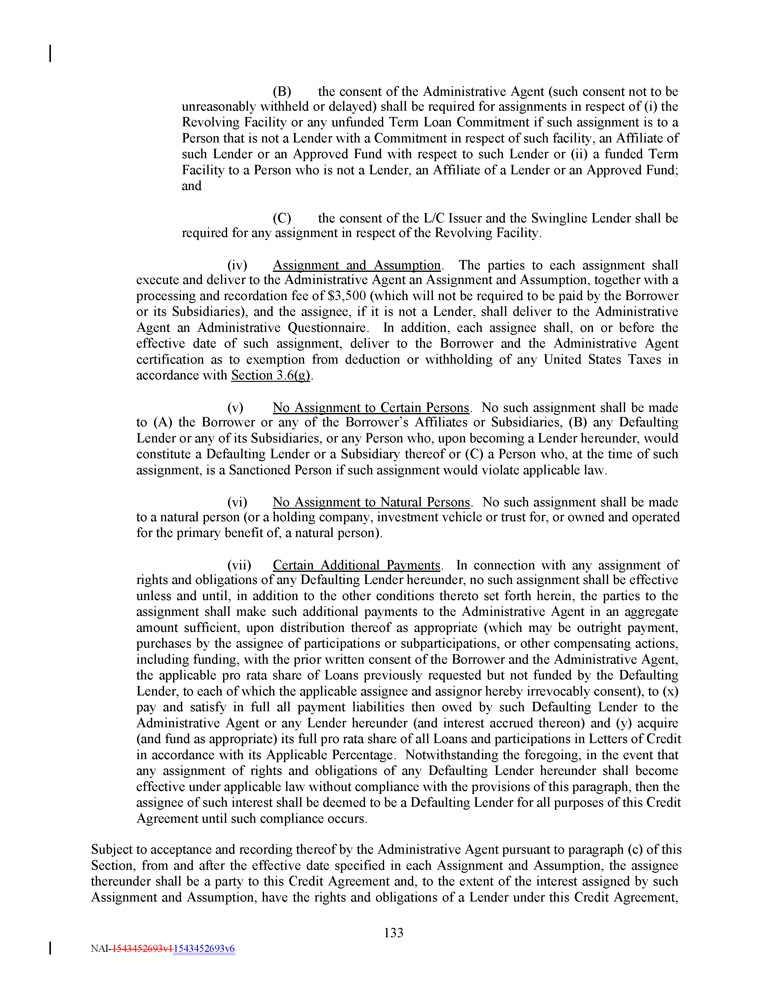 (B) the consent of the Administrative Agent (such consent not to be unreasonably withheld or delayed) shall be required for assignments in respect of (i) the Revolving Facility or any unfunded Term Loan Commitment if such assignment is to a Person that is not a Lender with a Commitment in respect of such facility, an Affiliate of such Lender or an Approved Fund with respect to such Lender or (ii) a funded Term Facility to a Person who is not a Lender, an Affiliate of a Lender or an Approved Fund ; and (C) the consent of the L/C Issuer and the Swingline Lender shall be required for any assignment in respect of the Revolving Facility . (iv) Assignment and Assumption . The parties to each assignment shall execute and deliver to the Administrative Agent an Assignment and Assumption, together with a processing and recordation fee of $ 3 , 500 (which will not be required to be paid by the Borrower or its Subsidiaries), and the assignee, if it is not a Lender, shall deliver to the Administrative Agent an Administrative Questionnaire . In addition, each assignee shall, on or before the effective date of such assignment, deliver to the Borrower and the Administrative Agent certification as to exemption from deduction or withholding of any United States Taxes in accordance with Section 3 . 6 (g) . (v) No Assignment to Certain Persons . No such assignment shall be made to (A) the Borrower or any of the Borrower’s Affiliates or Subsidiaries, (B) any Defaulting Lender or any of its Subsidiaries, or any Person who, upon becoming a Lender hereunder, would constitute a Defaulting Lender or a Subsidiary thereof or (C) a Person who, at the time of such assignment, is a Sanctioned Person if such assignment would violate applicable law . (vi) No Assignment to Natural Persons . No such assignment shall be made to a natural person (or a holding company, investment vehicle or trust for, or owned and operated for the primary benefit of, a natural person) . (vii) Certain Additional Payments . In connection with any assignment of rights and obligations of any Defaulting Lender hereunder, no such assignment shall be effective unless and until, in addition to the other conditions thereto set forth herein, the parties to the assignment shall make such additional payments to the Administrative Agent in an aggregate amount sufficient, upon distribution thereof as appropriate (which may be outright payment, purchases by the assignee of participations or subparticipations, or other compensating actions, including funding, with the prior written consent of the Borrower and the Administrative Agent, the applicable pro rata share of Loans previously requested but not funded by the Defaulting Lender, to each of which the applicable assignee and assignor hereby irrevocably consent), to (x) pay and satisfy in full all payment liabilities then owed by such Defaulting Lender to the Administrative Agent or any Lender hereunder (and interest accrued thereon) and (y) acquire (and fund as appropriate) its full pro rata share of all Loans and participations in Letters of Credit in accordance with its Applicable Percentage . Notwithstanding the foregoing, in the event that any assignment of rights and obligations of any Defaulting Lender hereunder shall become effective under applicable law without compliance with the provisions of this paragraph, then the assignee of such interest shall be deemed to be a Defaulting Lender for all purposes of this Credit Agreement until such compliance occurs . Subject to acceptance and recording thereof by the Administrative Agent pursuant to paragraph (c) of this Section, from and after the effective date specified in each Assignment and Assumption, the assignee thereunder shall be a party to this Credit Agreement and, to the extent of the interest assigned by such Assignment and Assumption, have the rights and obligations of a Lender under this Credit Agreement, 133 NAI - 1543452693v1 1543452693v6