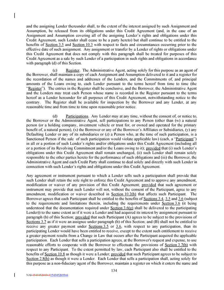 and the assigning Lender thereunder shall, to the extent of the interest assigned by such Assignment and Assumption, be released from its obligations under this Credit Agreement (and, in the case of an Assignment and Assumption covering all of the assigning Lender’s rights and obligations under this Credit Agreement, such Lender shall cease to be a party hereto) but shall continue to be entitled to the benefits of Section 3 . 5 and Section 10 . 3 with respect to facts and circumstances occurring prior to the effective date of such assignment . Any assignment or transfer by a Lender of rights or obligations under this Credit Agreement that does not comply with this paragraph shall be treated for purposes of this Credit Agreement as a sale by such Lender of a participation in such rights and obligations in accordance with paragraph (d) of this Section . (c) Register . The Administrative Agent, acting solely for this purpose as an agent of the Borrower, shall maintain a copy of each Assignment and Assumption delivered to it and a register for the recordation of the names and addresses of the Lenders, and the Commitments of, and principal amounts of the Loans owing to, each Lender pursuant to the terms hereof from time to time (the “ Register ”) . The entries in the Register shall be conclusive, and the Borrower, the Administrative Agent and the Lenders may treat each Person whose name is recorded in the Register pursuant to the terms hereof as a Lender hereunder for all purposes of this Credit Agreement, notwithstanding notice to the contrary . The Register shall be available for inspection by the Borrower and any Lender, at any reasonable time and from time to time upon reasonable prior notice . (d) Participations . Any Lender may at any time, without the consent of, or notice to, the Borrower or the Administrative Agent, sell participations to any Person (other than (w) a natural person (or a holding company, investment vehicle or trust for, or owned and operated for the primary benefit of, a natural person), (x) the Borrower or any of the Borrower’s Affiliates or Subsidiaries, (y) any Defaulting Lender or any of its subsidiaries or (z) a Person who, at the time of such participation, is a Sanctioned Person if the sale of such participation would violate applicable law) (each, a “ Participant ”) in all or a portion of such Lender’s rights and/or obligations under this Credit Agreement (including all or a portion of its Revolving Commitment and/or the Loans owing to it) ; provided that (i) such Lender’s obligations under this Credit Agreement shall remain unchanged, (ii) such Lender shall remain solely responsible to the other parties hereto for the performance of such obligations and (iii) the Borrower, the Administrative Agent and each Credit Party shall continue to deal solely and directly with such Lender in connection with such Lender’s rights and obligations under this Credit Agreement . Any agreement or instrument pursuant to which a Lender sells such a participation shall provide that such Lender shall retain the sole right to enforce this Credit Agreement and to approve any amendment, modification or waiver of any provision of this Credit Agreement ; provided that such agreement or instrument may provide that such Lender will not, without the consent of the Participant, agree to any amendment, modification or waiver described in Section 10 . 2 (b) that affects such Participant . The Borrower agrees that each Participant shall be entitled to the benefits of Sections 3 . 4 , 3 . 5 and 3 . 6 (subject to the requirements and limitations therein, including the requirements under Section 3 . 6 (it being understood that the documentation required under Section 3 . 6 (g) shall be delivered to the participating Lender)) to the same extent as if it were a Lender and had acquired its interest by assignment pursuant to paragraph (b) of this Section ; provided that such Participant (A) agrees to be subject to the provisions of Sections 3 . 7 as if it were an assignee under paragraph (b) of this Section ; and (B) shall not be entitled to receive any greater payment under Sections 3 . 5 or 3 . 6 , with respect to any participation, than its participating Lender would have been entitled to receive, except to the extent such entitlement to receive a greater payment results from a Change in Law that occurs after the Participant acquired the applicable participation . Each Lender that sells a participation agrees, at the Borrower's request and expense, to use reasonable efforts to cooperate with the Borrower to effectuate the provisions of Section 3 . 7 (b) with respect to any Participant . To the extent permitted by law, each Participant also shall be entitled to the benefits of Section 10 . 8 as though it were a Lender ; provided that such Participant agrees to be subject to Section 2 . 8 (h) as though it were a Lender . Each Lender that sells a participation shall, acting solely for this purpose as a non - fiduciary agent of the Borrower, maintain a register on which it enters the name and 134 NAI - 1543452693v1 1543452693v6
