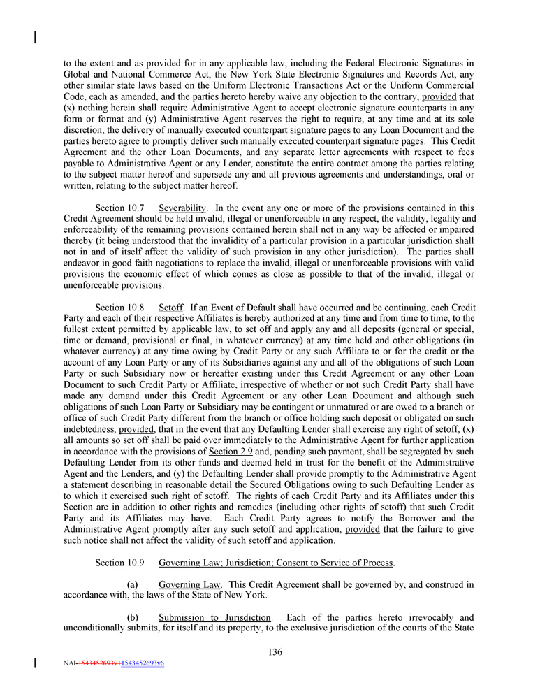 to the extent and as provided for in any applicable law, including the Federal Electronic Signatures in Global and National Commerce Act, the New York State Electronic Signatures and Records Act, any other similar state laws based on the Uniform Electronic Transactions Act or the Uniform Commercial Code, each as amended, and the parties hereto hereby waive any objection to the contrary, provided that (x) nothing herein shall require Administrative Agent to accept electronic signature counterparts in any form or format and (y) Administrative Agent reserves the right to require, at any time and at its sole discretion, the delivery of manually executed counterpart signature pages to any Loan Document and the parties hereto agree to promptly deliver such manually executed counterpart signature pages . This Credit Agreement and the other Loan Documents, and any separate letter agreements with respect to fees payable to Administrative Agent or any Lender, constitute the entire contract among the parties relating to the subject matter hereof and supersede any and all previous agreements and understandings, oral or written, relating to the subject matter hereof . Section 10 . 7 Severability . In the event any one or more of the provisions contained in this Credit Agreement should be held invalid, illegal or unenforceable in any respect, the validity, legality and enforceability of the remaining provisions contained herein shall not in any way be affected or impaired thereby (it being understood that the invalidity of a particular provision in a particular jurisdiction shall not in and of itself affect the validity of such provision in any other jurisdiction) . The parties shall endeavor in good faith negotiations to replace the invalid, illegal or unenforceable provisions with valid provisions the economic effect of which comes as close as possible to that of the invalid, illegal or unenforceable provisions . Section 10 . 8 Setoff . If an Event of Default shall have occurred and be continuing, each Credit Party and each of their respective Affiliates is hereby authorized at any time and from time to time, to the fullest extent permitted by applicable law, to set off and apply any and all deposits (general or special, time or demand, provisional or final, in whatever currency) at any time held and other obligations (in whatever currency) at any time owing by Credit Party or any such Affiliate to or for the credit or the account of any Loan Party or any of its Subsidiaries against any and all of the obligations of such Loan Party or such Subsidiary now or hereafter existing under this Credit Agreement or any other Loan Document to such Credit Party or Affiliate, irrespective of whether or not such Credit Party shall have made any demand under this Credit Agreement or any other Loan Document and although such obligations of such Loan Party or Subsidiary may be contingent or unmatured or are owed to a branch or office of such Credit Party different from the branch or office holding such deposit or obligated on such indebtedness, provided , that in the event that any Defaulting Lender shall exercise any right of setoff, (x) all amounts so set off shall be paid over immediately to the Administrative Agent for further application in accordance with the provisions of Section 2 . 9 and, pending such payment, shall be segregated by such Defaulting Lender from its other funds and deemed held in trust for the benefit of the Administrative Agent and the Lenders, and (y) the Defaulting Lender shall provide promptly to the Administrative Agent a statement describing in reasonable detail the Secured Obligations owing to such Defaulting Lender as to which it exercised such right of setoff . The rights of each Credit Party and its Affiliates under this Section are in addition to other rights and remedies (including other rights of setoff) that such Credit Party and its Affiliates may have . Each Credit Party agrees to notify the Borrower and the Administrative Agent promptly after any such setoff and application, provided that the failure to give such notice shall not affect the validity of such setoff and application . Section 10.9 Governing Law; Jurisdiction; Consent to Service of Process . (a) Governing Law . This Credit Agreement shall be governed by, and construed in accordance with, the laws of the State of New York. (b) Submission to Jurisdiction . Each of the parties hereto irrevocably and unconditionally submits, for itself and its property, to the exclusive jurisdiction of the courts of the State 136 NAI - 1543452693v1 1543452693v6