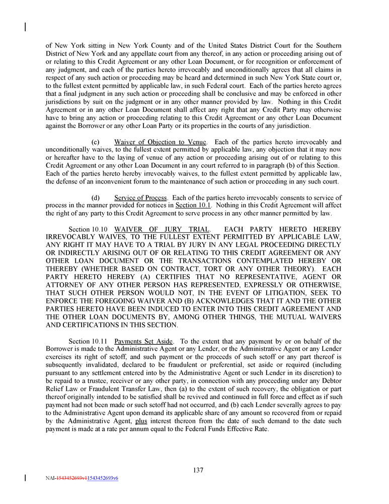 of New York sitting in New York County and of the United States District Court for the Southern District of New York and any appellate court from any thereof, in any action or proceeding arising out of or relating to this Credit Agreement or any other Loan Document, or for recognition or enforcement of any judgment, and each of the parties hereto irrevocably and unconditionally agrees that all claims in respect of any such action or proceeding may be heard and determined in such New York State court or, to the fullest extent permitted by applicable law, in such Federal court . Each of the parties hereto agrees that a final judgment in any such action or proceeding shall be conclusive and may be enforced in other jurisdictions by suit on the judgment or in any other manner provided by law . Nothing in this Credit Agreement or in any other Loan Document shall affect any right that any Credit Party may otherwise have to bring any action or proceeding relating to this Credit Agreement or any other Loan Document against the Borrower or any other Loan Party or its properties in the courts of any jurisdiction . (c) Waiver of Objection to Venue . Each of the parties hereto irrevocably and unconditionally waives, to the fullest extent permitted by applicable law, any objection that it may now or hereafter have to the laying of venue of any action or proceeding arising out of or relating to this Credit Agreement or any other Loan Document in any court referred to in paragraph (b) of this Section . Each of the parties hereto hereby irrevocably waives, to the fullest extent permitted by applicable law, the defense of an inconvenient forum to the maintenance of such action or proceeding in any such court . (d) Service of Process . Each of the parties hereto irrevocably consents to service of process in the manner provided for notices in Section 10 . 1 . Nothing in this Credit Agreement will affect the right of any party to this Credit Agreement to serve process in any other manner permitted by law . Section 10 . 10 WAIVER OF JURY TRIAL . EACH PARTY HERETO HEREBY IRREVOCABLY WAIVES, TO THE FULLEST EXTENT PERMITTED BY APPLICABLE LAW, ANY RIGHT IT MAY HAVE TO A TRIAL BY JURY IN ANY LEGAL PROCEEDING DIRECTLY OR INDIRECTLY ARISING OUT OF OR RELATING TO THIS CREDIT AGREEMENT OR ANY OTHER LOAN DOCUMENT OR THE TRANSACTIONS CONTEMPLATED HEREBY OR THEREBY (WHETHER BASED ON CONTRACT, TORT OR ANY OTHER THEORY) . EACH PARTY HERETO HEREBY (A) CERTIFIES THAT NO REPRESENTATIVE, AGENT OR ATTORNEY OF ANY OTHER PERSON HAS REPRESENTED, EXPRESSLY OR OTHERWISE, THAT SUCH OTHER PERSON WOULD NOT, IN THE EVENT OF LITIGATION, SEEK TO ENFORCE THE FOREGOING WAIVER AND (B) ACKNOWLEDGES THAT IT AND THE OTHER PARTIES HERETO HAVE BEEN INDUCED TO ENTER INTO THIS CREDIT AGREEMENT AND THE OTHER LOAN DOCUMENTS BY, AMONG OTHER THINGS, THE MUTUAL WAIVERS AND CERTIFICATIONS IN THIS SECTION . Section 10 . 11 Payments Set Aside . To the extent that any payment by or on behalf of the Borrower is made to the Administrative Agent or any Lender, or the Administrative Agent or any Lender exercises its right of setoff, and such payment or the proceeds of such setoff or any part thereof is subsequently invalidated, declared to be fraudulent or preferential, set aside or required (including pursuant to any settlement entered into by the Administrative Agent or such Lender in its discretion) to be repaid to a trustee, receiver or any other party, in connection with any proceeding under any Debtor Relief Law or Fraudulent Transfer Law, then (a) to the extent of such recovery, the obligation or part thereof originally intended to be satisfied shall be revived and continued in full force and effect as if such payment had not been made or such setoff had not occurred, and (b) each Lender severally agrees to pay to the Administrative Agent upon demand its applicable share of any amount so recovered from or repaid by the Administrative Agent, plus interest thereon from the date of such demand to the date such payment is made at a rate per annum equal to the Federal Funds Effective Rate . 137 NAI - 1543452693v1 1543452693v6