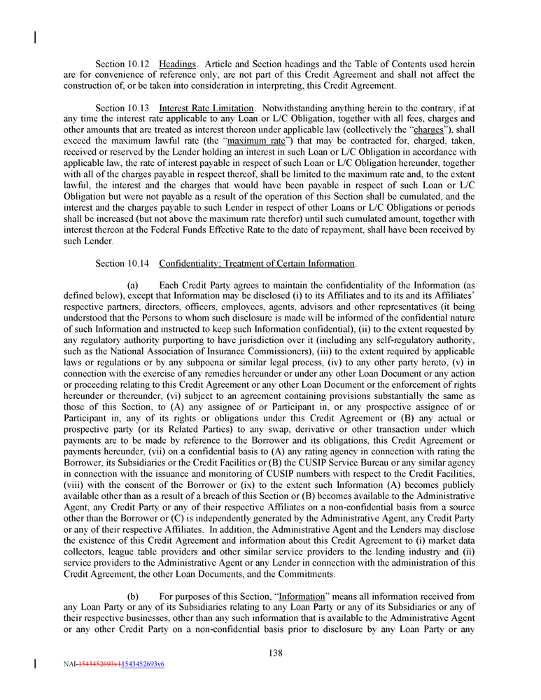 Section 10 . 12 Headings . Article and Section headings and the Table of Contents used herein are for convenience of reference only, are not part of this Credit Agreement and shall not affect the construction of, or be taken into consideration in interpreting, this Credit Agreement . Section 10 . 13 Interest Rate Limitation . Notwithstanding anything herein to the contrary, if at any time the interest rate applicable to any Loan or L/C Obligation, together with all fees, charges and other amounts that are treated as interest thereon under applicable law (collectively the “ charges ”), shall exceed the maximum lawful rate (the “ maximum rate ”) that may be contracted for, charged, taken, received or reserved by the Lender holding an interest in such Loan or L/C Obligation in accordance with applicable law, the rate of interest payable in respect of such Loan or L/C Obligation hereunder, together with all of the charges payable in respect thereof, shall be limited to the maximum rate and, to the extent lawful, the interest and the charges that would have been payable in respect of such Loan or L/C Obligation but were not payable as a result of the operation of this Section shall be cumulated, and the interest and the charges payable to such Lender in respect of other Loans or L/C Obligations or periods shall be increased (but not above the maximum rate therefor) until such cumulated amount, together with interest thereon at the Federal Funds Effective Rate to the date of repayment, shall have been received by such Lender . Section 10.14 Confidentiality; Treatment of Certain Information . (a) Each Credit Party agrees to maintain the confidentiality of the Information (as defined below), except that Information may be disclosed (i) to its Affiliates and to its and its Affiliates’ respective partners, directors, officers, employees, agents, advisors and other representatives (it being understood that the Persons to whom such disclosure is made will be informed of the confidential nature of such Information and instructed to keep such Information confidential), (ii) to the extent requested by any regulatory authority purporting to have jurisdiction over it (including any self - regulatory authority, such as the National Association of Insurance Commissioners), (iii) to the extent required by applicable laws or regulations or by any subpoena or similar legal process, (iv) to any other party hereto, (v) in connection with the exercise of any remedies hereunder or under any other Loan Document or any action or proceeding relating to this Credit Agreement or any other Loan Document or the enforcement of rights hereunder or thereunder, (vi) subject to an agreement containing provisions substantially the same as those of this Section, to (A) any assignee of or Participant in, or any prospective assignee of or Participant in, any of its rights or obligations under this Credit Agreement or (B) any actual or prospective party (or its Related Parties) to any swap, derivative or other transaction under which payments are to be made by reference to the Borrower and its obligations, this Credit Agreement or payments hereunder, (vii) on a confidential basis to (A) any rating agency in connection with rating the Borrower, its Subsidiaries or the Credit Facilities or (B) the CUSIP Service Bureau or any similar agency in connection with the issuance and monitoring of CUSIP numbers with respect to the Credit Facilities, (viii) with the consent of the Borrower or (ix) to the extent such Information (A) becomes publicly available other than as a result of a breach of this Section or (B) becomes available to the Administrative Agent, any Credit Party or any of their respective Affiliates on a non - confidential basis from a source other than the Borrower or (C) is independently generated by the Administrative Agent, any Credit Party or any of their respective Affiliates . In addition, the Administrative Agent and the Lenders may disclose the existence of this Credit Agreement and information about this Credit Agreement to (i) market data collectors, league table providers and other similar service providers to the lending industry and (ii) service providers to the Administrative Agent or any Lender in connection with the administration of this Credit Agreement, the other Loan Documents, and the Commitments . (b) For purposes of this Section, “ Information ” means all information received from any Loan Party or any of its Subsidiaries relating to any Loan Party or any of its Subsidiaries or any of their respective businesses, other than any such information that is available to the Administrative Agent or any other Credit Party on a non - confidential basis prior to disclosure by any Loan Party or any 138 NAI - 1543452693v1 1543452693v6
