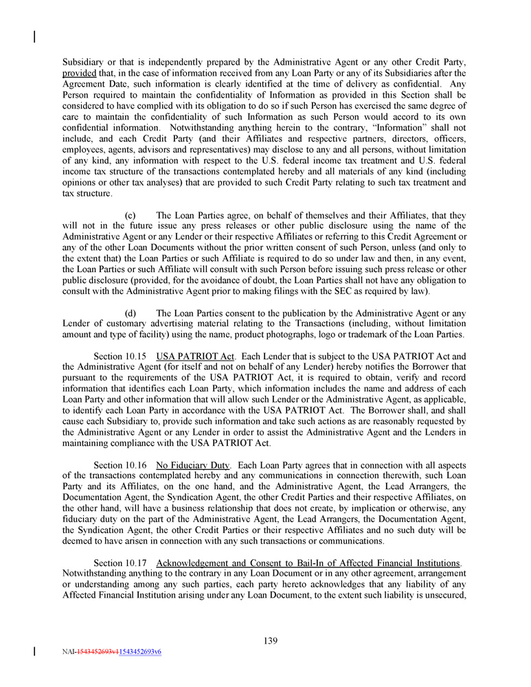 Subsidiary or that is independently prepared by the Administrative Agent or any other Credit Party, provided that, in the case of information received from any Loan Party or any of its Subsidiaries after the Agreement Date, such information is clearly identified at the time of delivery as confidential . Any Person required to maintain the confidentiality of Information as provided in this Section shall be considered to have complied with its obligation to do so if such Person has exercised the same degree of care to maintain the confidentiality of such Information as such Person would accord to its own confidential information . Notwithstanding anything herein to the contrary, “Information” shall not include, and each Credit Party (and their Affiliates and respective partners, directors, officers, employees, agents, advisors and representatives) may disclose to any and all persons, without limitation of any kind, any information with respect to the U . S . federal income tax treatment and U . S . federal income tax structure of the transactions contemplated hereby and all materials of any kind (including opinions or other tax analyses) that are provided to such Credit Party relating to such tax treatment and tax structure . (c) The Loan Parties agree, on behalf of themselves and their Affiliates, that they will not in the future issue any press releases or other public disclosure using the name of the Administrative Agent or any Lender or their respective Affiliates or referring to this Credit Agreement or any of the other Loan Documents without the prior written consent of such Person, unless (and only to the extent that) the Loan Parties or such Affiliate is required to do so under law and then, in any event, the Loan Parties or such Affiliate will consult with such Person before issuing such press release or other public disclosure (provided, for the avoidance of doubt, the Loan Parties shall not have any obligation to consult with the Administrative Agent prior to making filings with the SEC as required by law) . (d) The Loan Parties consent to the publication by the Administrative Agent or any Lender of customary advertising material relating to the Transactions (including, without limitation amount and type of facility) using the name, product photographs, logo or trademark of the Loan Parties . Section 10 . 15 USA PATRIOT Act . Each Lender that is subject to the USA PATRIOT Act and the Administrative Agent (for itself and not on behalf of any Lender) hereby notifies the Borrower that pursuant to the requirements of the USA PATRIOT Act, it is required to obtain, verify and record information that identifies each Loan Party, which information includes the name and address of each Loan Party and other information that will allow such Lender or the Administrative Agent, as applicable, to identify each Loan Party in accordance with the USA PATRIOT Act . The Borrower shall, and shall cause each Subsidiary to, provide such information and take such actions as are reasonably requested by the Administrative Agent or any Lender in order to assist the Administrative Agent and the Lenders in maintaining compliance with the USA PATRIOT Act . Section 10 . 16 No Fiduciary Duty . Each Loan Party agrees that in connection with all aspects of the transactions contemplated hereby and any communications in connection therewith, such Loan Party and its Affiliates, on the one hand, and the Administrative Agent, the Lead Arrangers, the Documentation Agent, the Syndication Agent, the other Credit Parties and their respective Affiliates, on the other hand, will have a business relationship that does not create, by implication or otherwise, any fiduciary duty on the part of the Administrative Agent, the Lead Arrangers, the Documentation Agent, the Syndication Agent, the other Credit Parties or their respective Affiliates and no such duty will be deemed to have arisen in connection with any such transactions or communications . Section 10.17 Acknowledgement and Consent to Bail - In of Affected Financial Institutions . Notwithstanding anything to the contrary in any Loan Document or in any other agreement, arrangement or understanding among any such parties, each party hereto acknowledges that any liability of any Affected Financial Institution arising under any Loan Document, to the extent such liability is unsecured, 139 NAI - 1543452693v1 1543452693v6