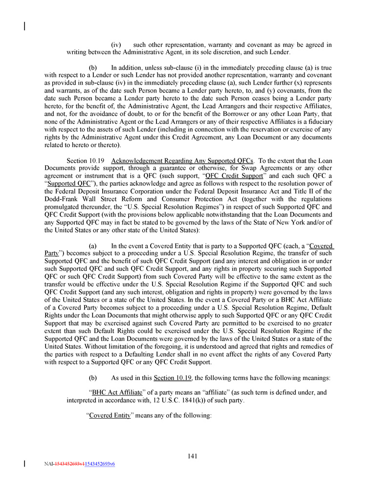 (iv) such other representation, warranty and covenant as may be agreed in writing between the Administrative Agent, in its sole discretion, and such Lender. (b) In addition, unless sub - clause (i) in the immediately preceding clause (a) is true with respect to a Lender or such Lender has not provided another representation, warranty and covenant as provided in sub - clause (iv) in the immediately preceding clause (a), such Lender further (x) represents and warrants, as of the date such Person became a Lender party hereto, to, and (y) covenants, from the date such Person became a Lender party hereto to the date such Person ceases being a Lender party hereto, for the benefit of, the Administrative Agent, the Lead Arrangers and their respective Affiliates, and not, for the avoidance of doubt, to or for the benefit of the Borrower or any other Loan Party, that none of the Administrative Agent or the Lead Arrangers or any of their respective Affiliates is a fiduciary with respect to the assets of such Lender (including in connection with the reservation or exercise of any rights by the Administrative Agent under this Credit Agreement, any Loan Document or any documents related to hereto or thereto) . Section 10 . 19 Acknowledgement Regarding Any Supported QFCs . To the extent that the Loan Documents provide support, through a guarantee or otherwise, for Swap Agreements or any other agreement or instrument that is a QFC (such support, “ QFC Credit Support ” and each such QFC a “ Supported QFC ”), the parties acknowledge and agree as follows with respect to the resolution power of the Federal Deposit Insurance Corporation under the Federal Deposit Insurance Act and Title II of the Dodd - Frank Wall Street Reform and Consumer Protection Act (together with the regulations promulgated thereunder, the “U . S . Special Resolution Regimes”) in respect of such Supported QFC and QFC Credit Support (with the provisions below applicable notwithstanding that the Loan Documents and any Supported QFC may in fact be stated to be governed by the laws of the State of New York and/or of the United States or any other state of the United States) : (a) In the event a Covered Entity that is party to a Supported QFC (each, a “ Covered Party ”) becomes subject to a proceeding under a U . S . Special Resolution Regime, the transfer of such Supported QFC and the benefit of such QFC Credit Support (and any interest and obligation in or under such Supported QFC and such QFC Credit Support, and any rights in property securing such Supported QFC or such QFC Credit Support) from such Covered Party will be effective to the same extent as the transfer would be effective under the U . S . Special Resolution Regime if the Supported QFC and such QFC Credit Support (and any such interest, obligation and rights in property) were governed by the laws of the United States or a state of the United States . In the event a Covered Party or a BHC Act Affiliate of a Covered Party becomes subject to a proceeding under a U . S . Special Resolution Regime, Default Rights under the Loan Documents that might otherwise apply to such Supported QFC or any QFC Credit Support that may be exercised against such Covered Party are permitted to be exercised to no greater extent than such Default Rights could be exercised under the U . S . Special Resolution Regime if the Supported QFC and the Loan Documents were governed by the laws of the United States or a state of the United States . Without limitation of the foregoing, it is understood and agreed that rights and remedies of the parties with respect to a Defaulting Lender shall in no event affect the rights of any Covered Party with respect to a Supported QFC or any QFC Credit Support . (b) As used in this Section 10 . 19 , the following terms have the following meanings : “ BHC Act Affiliate ” of a party means an “affiliate” (as such term is defined under, and interpreted in accordance with, 12 U . S . C . 1841 (k)) of such party . “ Covered Entity ” means any of the following: 141 NAI - 1543452693v1 1543452693v6