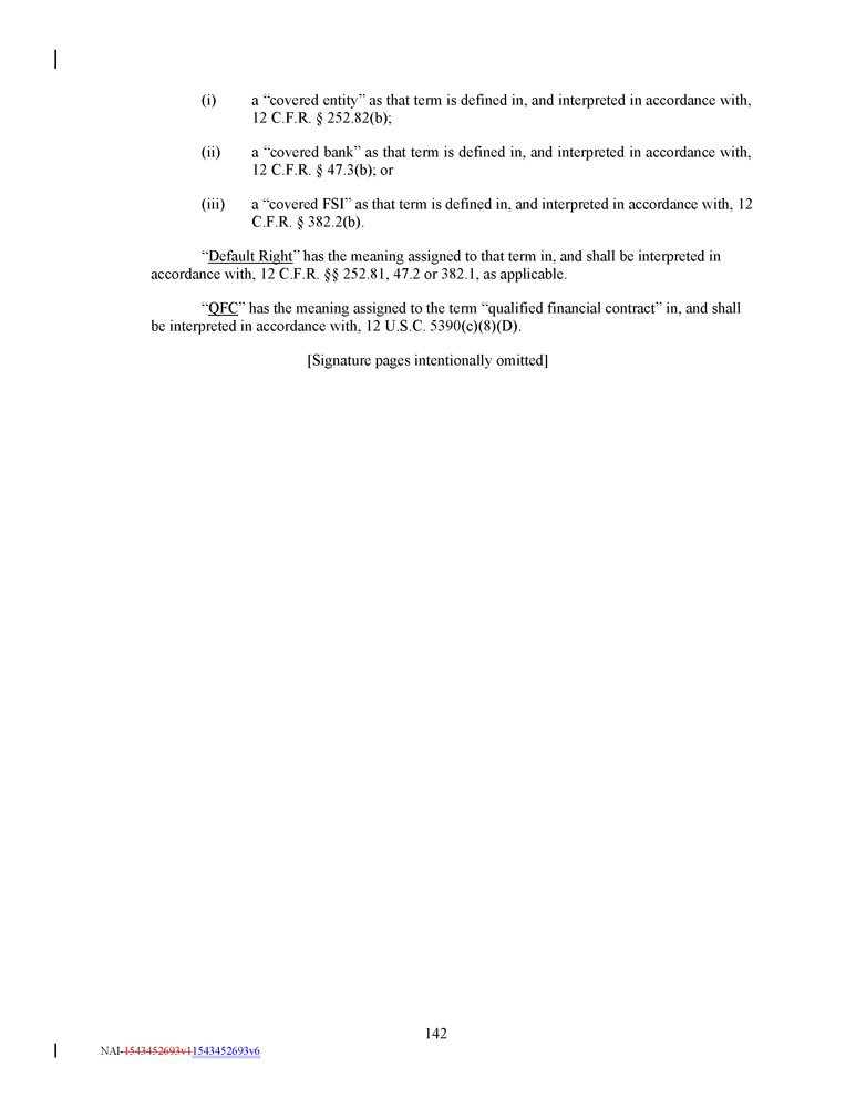 (i) 142 NAI - 1543452693v1 1543452693v6 a “covered entity” as that term is defined in, and interpreted in accordance with, 12 C.F.R. † 252.82(b); (ii) a “covered bank” as that term is defined in, and interpreted in accordance with, 12 C.F.R. † 47.3(b); or (iii) a “covered FSI” as that term is defined in, and interpreted in accordance with, 12 C.F.R. † 382.2(b). “ Default Right ” has the meaning assigned to that term in, and shall be interpreted in accordance with, 12 C.F.R. †† 252.81, 47.2 or 382.1, as applicable. “ QFC ” has the meaning assigned to the term “qualified financial contract” in, and shall be interpreted in accordance with, 12 U.S.C. 5390(c)(8)(D). [Signature pages intentionally omitted]