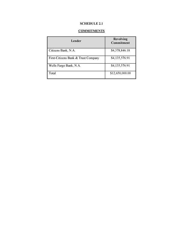 SCHEDULE 2.1 COMMITMENTS Revolving Commitment Lender $4,378,846.18 Citizens Bank, N.A. $4,135,576.91 First - Citizens Bank & Trust Company $4,135,576.91 Wells Fargo Bank, N.A. $12,650,000.00 Total