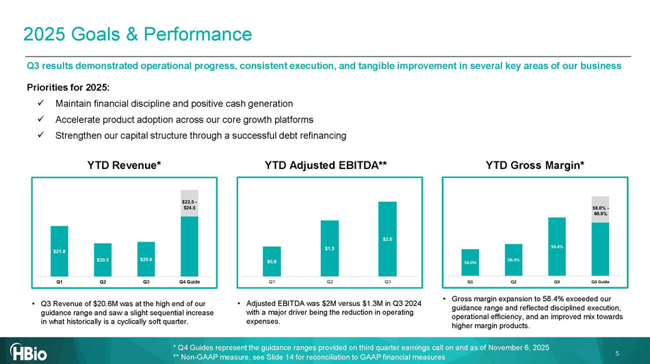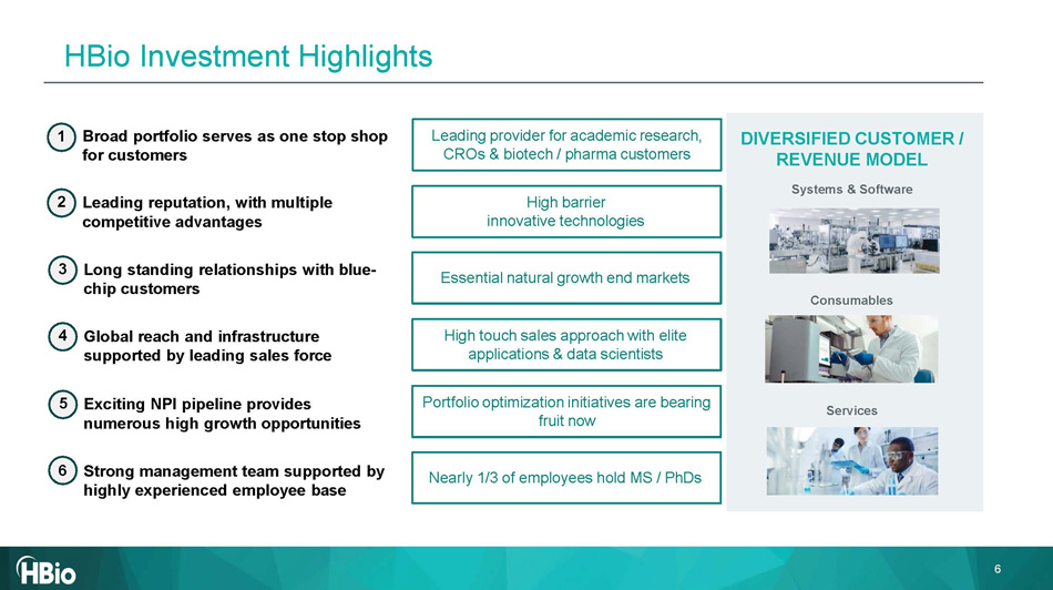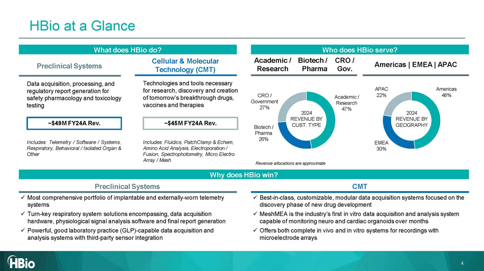 Who does HBio s erve? Preclinical Systems CMT Why does HBio w in? 2024 REVENUE BY GEOGRAPHY 2024 REVENUE BY CUST. TYPE Revenue allocations are approximate x Most comprehensive portfolio of implantable and externally - worn telemetry systems x Turn - key respiratory system solutions encompassing, data acquisition hardware, physiological signal analysis software and final report generation x Powerful, good laboratory practice (GLP) - capable data acquisition and analysis systems with third - party sensor integration x Best - in - class, customizable, modular data acquisition systems focused on the discovery phase of new drug development x MeshMEA is the industry’s first in vitro data acquisition and analysis system capable of monitoring neuro and cardiac organoids over months x Offers both complete in vivo and in vitro systems for recordings with microelectrode arrays Americas 48% EMEA 30% APAC 22% Biotech / P h arma Academic / Research CRO / Gov. Biotech / P h arma 26% Academic / Research 47% CRO / Government 27% What does HBio do ? Cellular & Molecular Technology (CMT) Technologies and tools necessary for research, discovery and creation of tomorrow’s breakthrough drugs, vaccines and therapies Includes : Telemetry / Software / Systems, Respiratory, Behavioral / Isolated Organ & Other Preclinical Systems Data acquisition, processing, and regulatory report generation for safety pharmacology and toxicology testing Includes: Fluidics, PatchClamp & Echem, Amino Acid Analysis, Electroporation / Fusion, Spectrophotometry, Micro Electro Array / Mesh Americas | EMEA | APAC 4 ~$4 5 M FY24A Rev. ~$49M FY24A Rev. HBio at a Glance