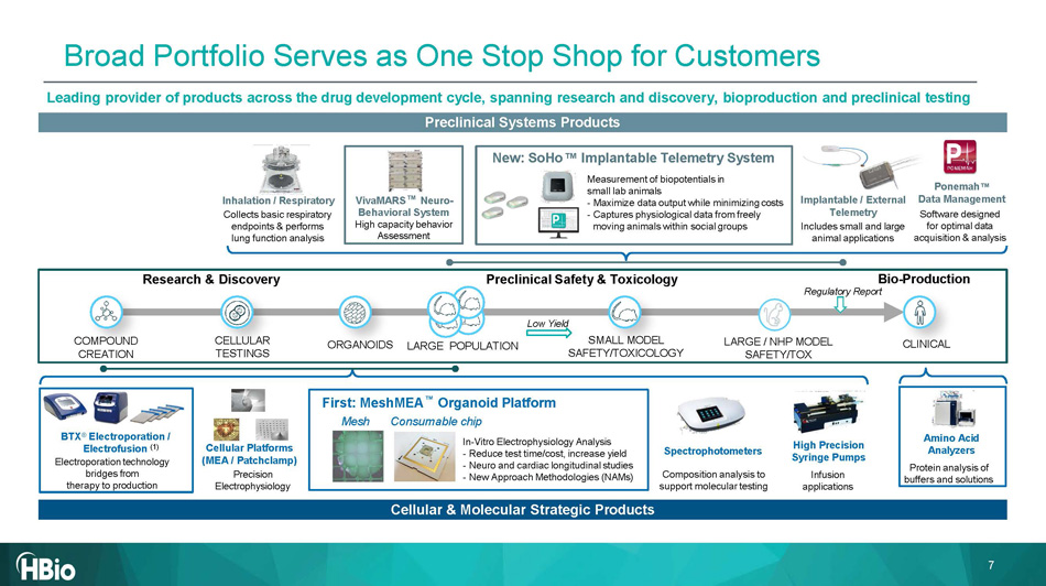 Essential natural growth end markets High barrier innovative technologies High touch sales approach with elite applications & data scientists Leading provider for academic research, CROs & biotech / pharma customers DIVERSIFIED CUSTOMER / REVENUE MODEL Systems & Software Consumables Services Portfolio optimization initiatives are bearing fruit now Nearly 1/3 of employees hold MS / PhDs 1 Broad portfolio serves as one stop shop for customers 2 Leading reputation , with multiple competitive advantages 3 Long standing relationships with blue - chip customers 4 Global reach and infrastructure supported by leading sales force 5 Exciting NPI pipeline provides numerous high growth opportunities 6 Strong management team supported by highly experienced employee base 6 HBio Investment Highlights