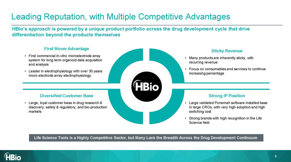 Research & Discovery Preclinical Safety & Toxicology CELLULAR TESTINGS COMPOUND CREATION CLINICAL SMALL MODEL SAFETY/TOXICOLOGY LARGE / NHP MODEL SAFETY/TOX Bio - Production Regulatory Report Low Yield ORGANOIDS LARGE POPULATION Leading provider of products across the drug development cycle, spanning research and discovery, bioproduction and preclinical testing Cellular & Molecular Strategic Products Preclinical Systems Products BTX ® Electroporation / Electrofusion (1) Electroporation technology bridges from therapy to production Cellular Platforms (MEA / Patchclamp) Precision Electrophysiology First: MeshMEA Organoid Platform Mesh Consumable chip In - Vitro Electrophysiology Analysis - Reduce test time/cost, increase yield - Neuro and cardiac longitudinal studies - New Approach Methodologies (NAMs) Amino Acid Analyzers Protein analysis of buffers and solutions Spectrophotometers Composition analysis to support molecular testing High Precision Syringe Pumps Infusion applications VivaMARS Neuro - Behavioral System High capacity behavior Assessment Ponemah Data Management Software designed for optimal data acquisition & analysis Inhalation / Respiratory Collects basic respiratory endpoints & performs lung function analysis New: SoHo Implantable Telemetry System Measurement of biopotentials in small lab animals - Maximize data output while minimizing costs - Captures physiological data from freely moving animals within social groups Implantable / External Telemetry Includes small and large animal applications 7 Broad Portfolio Serves as One Stop Shop for Customers