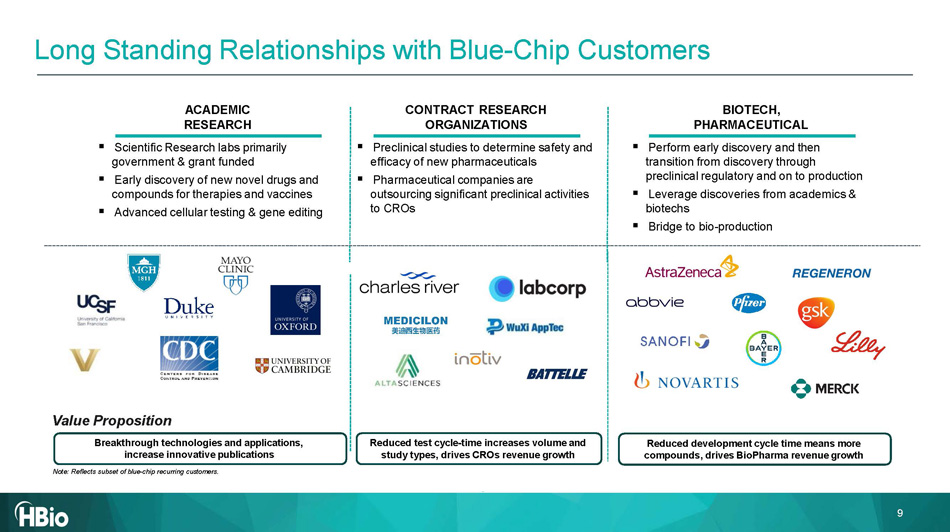 Leading Reputation , with Multiple Competitive Advantages HBio’s approach is powered by a unique product portfolio across the drug development cycle that drive differentiation beyond the products themselves 8 Diversified Customer Base • Large, loyal customer base in drug research & discovery, safety & regulatory, and bio - production markets First Mover Advantage • First commercial in - vitro microelectrode array system for long term organoid data acquisition and analysis • Leader in electrophysiology with over 30 years micro electrode array electrophysiology Sticky Revenue • Many products are inherently sticky, with recurring revenue • Focus on consumables and services to continue increasing percentage Strong IP Position • Large validated Ponemah software installed base in large CROs, with very high adoption and high switching cost • Strong brands with high recognition in the Life Science field Life Science Tools is a Highly Competitive Sector, but Many Lack the Breadth Across the Drug Development Continuum