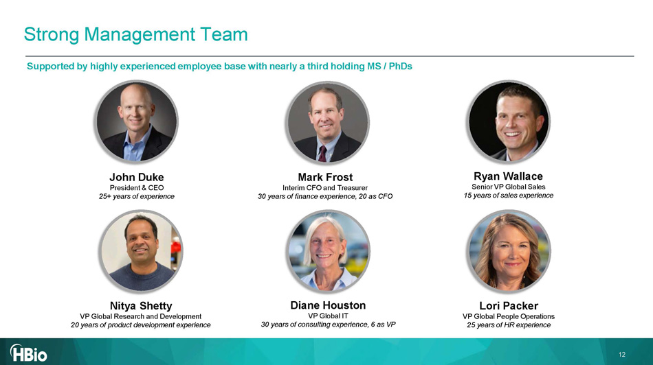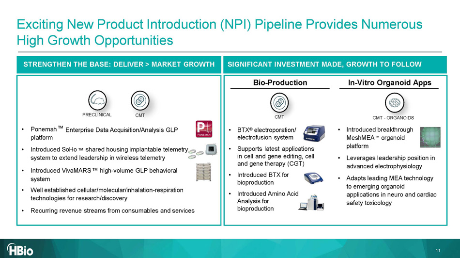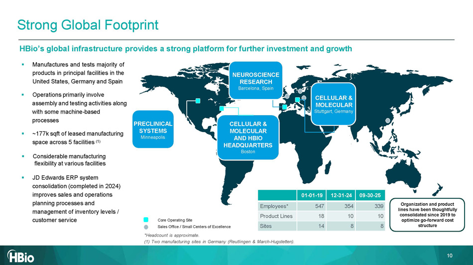 CELLULAR & MOLECULAR AND HBIO HEADQUARTERS Boston PRECLINICAL SYSTEMS Minneapolis Core Operating Site Sales Office / Small Centers of Excellence *Headcount is approximate. (1) Two manufacturing sites in Germany (Reutlingen & March - Hugstetten). 0 9 - 30 - 25 12 - 31 - 24 01 - 01 - 19 33 9 354 547 Employees* 10 10 18 Product Lines 8 8 14 Sites HBio’s global infrastructure provides a strong platform for further investment and growth ▪ Manufactures and tests majority of products in principal facilities in the United States, Germany and Spain ▪ Operations primarily involve assembly and testing activities along with some machine - based processes ▪ ~177k sqft of leased manufacturing space across 5 facilities (1) ▪ Considerable manufacturing flexibility at various facilitie s ▪ JD Edwards ERP system consolidation (completed in 2024) improves sales and operations planning processes and management of inventory levels / customer service NEUROSCIENCE RESEARCH Barcelona, Spain Strong Global Footprint Organization and product lines have been thoughtfully consolidated since 2019 to optimize go - forward cost structure CELLULAR & 10 MOLECULAR Stuttgart, Germany