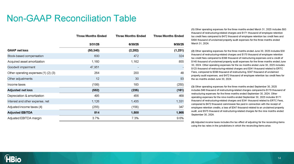 Three Months Ended Three Months Ended Three Months Ended 9 /3 0 /2 5 6 /3 0 /2 5 3 /31/2 5 (1, 231 ) (2,282) (50,340) GAAP net loss 324 472 600 Stock - based compensation 855 1,162 1,160 Acquired asset amortization - - 47,951 Goodwill impairment 48 200 264 Other operating expenses (1) (2) (3) 93 30 12 Other adjustments (250) 183 (199) Income taxes (161) (235) (552) Adjusted net loss 468 456 495 Depreciation & amortization 1,331 1,435 1,126 Interest and other expense, net 347 (156) (255) Adjusted income taxes (4) 1,985 1,500 814 Adjusted EBITDA 9.6% 7.3% 3.7% Adjusted EBITDA margin 14 Non - GAAP Reconciliation Table (1) Other operating expenses for the three months ended March 31, 2025 includes $93 thousand of restructuring - related charges and $171 thousand of employee retention tax credit fees compared to $472 thousand of employee retention tax credit fees and $494 thousand of unclaimed property audit expenses for the three months ended March 31, 2024. (2) Other operating expenses for the three months ended June 30, 2025 includes $30 thousand of restructuring - related charges and $170 thousand of employee retention tax credit fees compared to $396 thousand of restructuring expenses and a credit of $145 thousand of unclaimed property audit expenses for the three months ended June 30, 2024. Other operating expenses for the six months ended June 30, 2025 includes $123 thousand of restructuring - related charges and $341 thousand related to ERTC Fees, compared to $396 thousand of restructuring, $347 thousand of unclaimed property audit expenses, and $472 thousand of employee retention tax credit fees for the six months ended June 30, 2024. (3) Other operating expenses for the three months ended September 30, 2025 includes $48 thousand of restructuring - related charges compared to $179 thousand of restructuring expenses for the three months ended September 30, 2024. Other operating expenses for the nine months ended September 30, 2025 includes $171 thousand of restructuring - related charges and $341 thousand related to ERTC Fees, compared to $472 thousand commission fee paid in connection with the receipt of employee retention credits, a loss of $347 thousand related to an unclaimed property audit, and $575 thousand of restructuring - related charges for the nine months ended September 30, 2024. (4) Adjusted income taxes includes the tax effect of adjusting for the reconciling items using the tax rates in the jurisdictions in which the reconciling items arise.