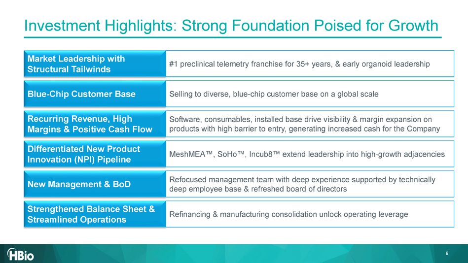 Recent Actions ✔ New Executive Leadership: Appointed John Duke CEO effective July 2025 & made Mark Frost permanent CFO in March of 2026 ✔ Debt Refinancing: E xtended debt maturity to 2029, reduced annual debt service generating $3 million in annual cash savings, & enhanced financial flexibility to support long term growth objectives & BroadOak made $7.5M investment in convertible notes ✔ Expanded Board of Directors: Appointed Rob Gagnon & Seth Benson effective July 2025, Stephen DeNelsky effective September 2025, BroadOak Partner Bill Snider effective December 2025 ✔ Strategic Consolidation: Streamlining production footprint & improving manufacturing efficiency through phased closure of Holliston, MA plant – expected to deliver approximately $3 million of adjusted EBITDA improvement in 2027 and $4 million of improvement beginning in 2028 5 ✔ Focused Strategic Direction: Announced focus on Translational Science products in February 2026