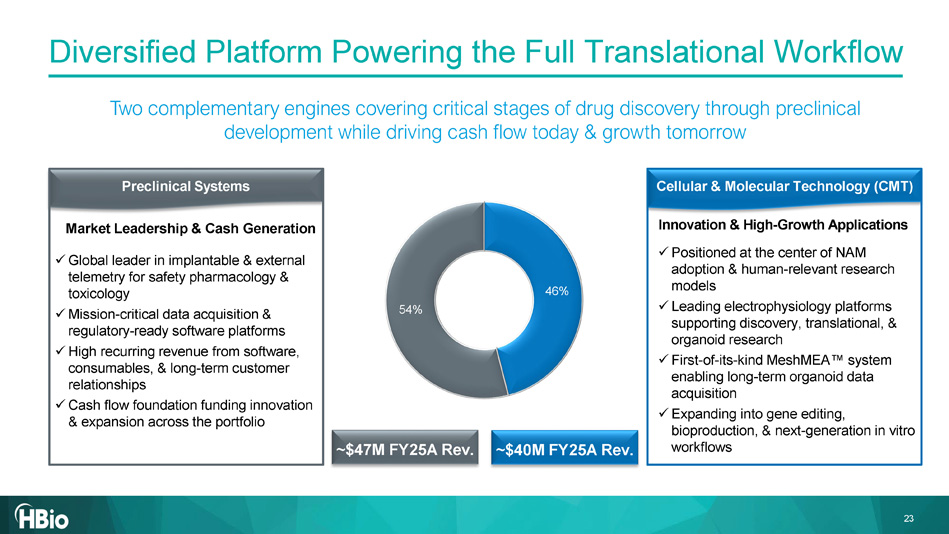 x Global leader in implantable & external telemetry for safety pharmacology & toxicology x Mission - critical data acquisition & regulatory - ready software platforms x High recurring revenue from software, consumables, & long - term customer relationships x Cash flow foundation funding innovation & expansion across the portfolio x Positioned at the center of NAM adoption & human - relevant research models x Leading electrophysiology platforms supporting discovery, translational, & organoid research x First - of - its - kind MeshMEA system enabling long - term organoid data acquisition x Expanding into gene editing, bioproduction, & next - generation in vitro workflows Cellular & Molecular Technology (CMT) Innovation & High - Growth Applications Preclinical Systems Market Leadership & Cash Generation 23 ~$4 0 M FY2 5 A Rev. ~$4 7 M FY2 5 A Rev. Diversified Platform Powering the Full Translational Workflow Two complementary engines covering critical stages of drug discovery through preclinical development while driving cash flow today & growth tomorrow 46% 54%