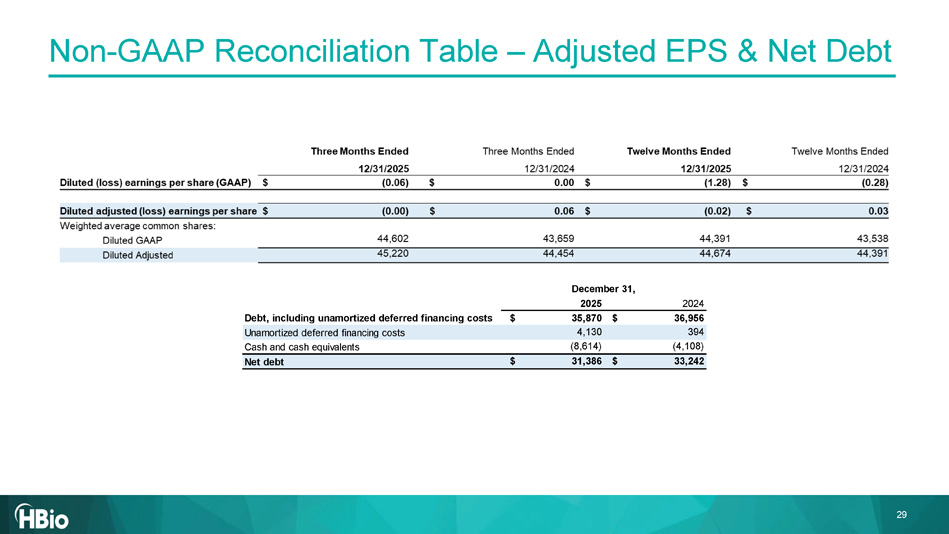 28 (1) Other operating expenses for the year ended December 31, 2025, were $0.7 million, including a fee of $0.5 million in connecti on with the receipt of employee retention tax credits and restructuring costs of $0.2 million in connection with headcount reductions. Other operating expenses for the year ended December 31, 2024, we re $1.6 million, including $0.8 million in connection with headcount reductions, a fee of $0.5 million in connection with the receipt of employee retention tax credits, and $0.3 million related to settlement of an unclaimed property audit. Other operating expenses for the three months ended December 31, 2025 includes $0.2 million of commission feed paid in connection with the receipt of employee re tention credits. Other operating expenses for the three months ended December 31, 2024 includes $0.2 million of restructuring charges. (2) Adjusted income taxes includes the tax effect of adjusting for the reconciling items using the tax rates in the jurisdictions in which the reconciling items arise. Non - GAAP Reconciliation Table – Adjusted EBITDA Three Months Ended Three Months Ended Twelve Months Ended Twelve Months Ended 12/31/2025 12/31/2024 12/31/2025 12/31/2024 GAAP net loss $ (2,847) $ 18 $ (56,700) $ (12,405) Stock-based compensation 459 961 1,855 4,340 Acquired asset amortization 850 1,257 4,027 5,255 Goodwill impairment - - 47,951 - Other operating expenses (1) 217 217 729 1,611 Loss on pension settlement 1,233 - 1,233 - Other adjustments 46 42 181 299 Loss on equity securities - - - 1,593 Income taxes (11) 191 (277) 568 Adjusted net (loss) income (53) 2,686 (1,001) 1,261 Depreciation & amortization 501 503 1,918 1,902 Interest and other expense, net 3,681 (579) 7,573 3,861 Adjusted income taxes (2) (346) 381 (409) 172 Adjusted EBITDA $ 3,783 $ 2,991 $ 8,081 $ 7,196 Adjusted EBITDA margin 15.9% 12.2% 9.3% 7.6%
