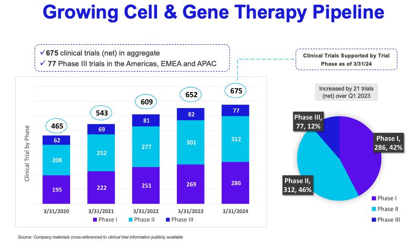 As of March 31, 2024, Cryoport supported a total of 675 global clinical trials, a net increase of 23 clinical trials over March 31, 2023 with 77 of these clinical trials in Phase 3 . The number of trials by phase and region are as follows: