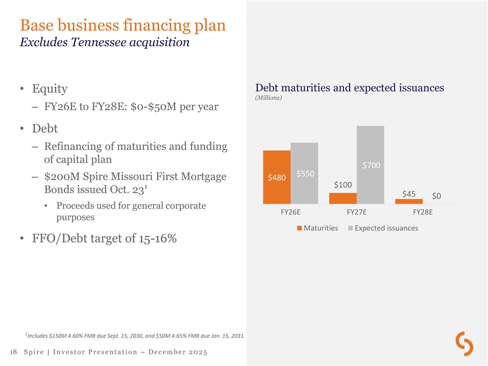 1 FY26 guidance by segment Key drivers compared to FY25 Adjusted earnings by business segment (Millions) Gas Utility FY25 FY26 • New rates: actual target – Spire Missouri base rates effective in Oct. and ISRS Gas Utility $231 $285 – $315 – Spire Alabama and Gulf rates effective in Dec. Gas Marketing 26 19 – 23 • O&M expense targeted below the rate of inflation Midstream 56 42– 48 • Higher depreciation and interest expense Corporate & other (38) (37) – (31) Gas Marketing • Rebased reflecting current market conditions Midstream FY26 adjusted earnings Midstream • Full year of storage operations: – Higher O&M, depreciation and interest expense reflecting scale ~35% – Decrease in expected optimization earnings ~65% • Pipelines executing at run-rate Corporate & other • Lower interest expense primarily due to lower long-term rates Pipelines Storage 1 Excludes the results of the pending acquisition of the Piedmont Tennessee business. 17 S p i r e | I n v e s t o r P r e s e n t a t i o n – D e c e m b e r 2 0 2 5