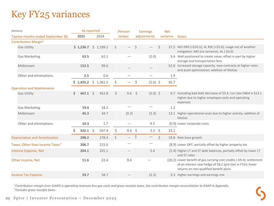 Key FY25 variances (Millions) As reported Pension Earnings Net reclass adjustments variance Twelve months ended September 30, 2025 2024 Notes 1 Contribution Margin MO ISRS (+$33.5); AL RSE (+$5.0); usage net of weather Gas Utility $ 1,236.7 $ 1, 199.2 $ ― $ ― $ 37 .5 mitigation: MO (no variance), AL (-$3.0) Gas Marketing 63.5 62 .1 $ ― (2.0) 3.4 Well positioned to create value; offset in part by higher storage and transportation fees Increased storage capacity, new contracts at higher rates Midstream 152.5 99 .6 52.9 $ ― $ ― and asset optimization; addition of MoGas Other and eliminations 2.5 0.6 $ ― $ ― 1.9 $ 1,455.2 $ 1, 361.5 $ ― $ (2.0) $ 95 .7 Operation and Maintenance Excluding bad debt decrease of $3.4, run-rate O&M is $13.1 Gas Utility $ 467.1 $ 452.8 $ 9.6 $ ( 5.0) $ 9.7 higher due to higher employee costs and operating expenses $ ― $ ― Gas Marketing 19.4 18 .2 1.2 Midstream 45.3 34 .7 (0.2) (2.3) 13.1 Higher operational costs due to higher activity; addition of MoGas Other and eliminations 10.3 1.7 $ ― 9.5 (0.9) Lower corporate costs $ 542.1 $ 507.4 $ 9.4 $ 2.2 $ 23 .1 $ ― Depreciation and Amortization 298.2 278.4 $ ― $ 19 .8 Rate base growth 2 $ ― $ ― Taxes, Other than Income Taxes 206.7 215.6 ( 8.9) Lower GRT, partially offset by higher property tax Interest Expense, Net 204.1 201.1 $ ― 5.4 ( 2.4) Higher LT and ST debt balances, partially offset by lower LT and ST rates Lower benefit of gas carrying cost credits (-$9.4); settlement Other Income, Net 11.6 22 .4 9.4 $ ― (20.2) of an interest rate hedge of $8.2 (pre-tax) in FY24; lower returns on non-qualified benefit plans Higher earnings and earnings mix Income Tax Expense 59.7 58 .7 $ ― (2.3) 3.3 1 Contribution margin (non-GAAP) is operating revenues less gas costs and gross receipts taxes. See contribution margin reconciliation to GAAP in Appendix. 2 Excludes gross receipts taxes. 29 S p i r e | I n v e s t o r P r e s e n t a t i o n – D e c e m b e r 2 0 2 5
