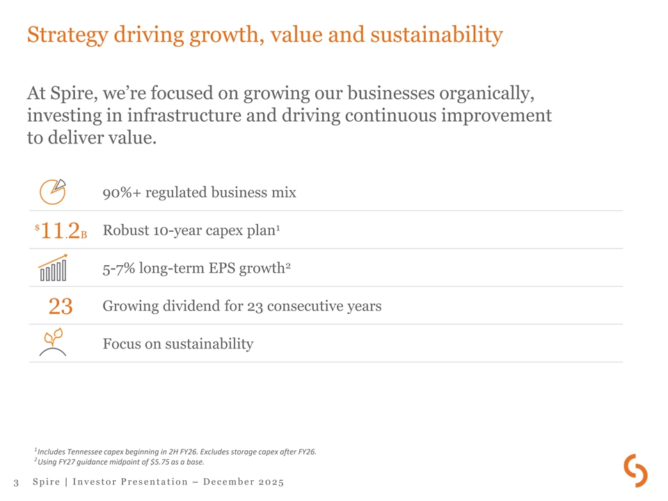 Spire at-a-glance Gas Utilities • Regulated natural gas LDCs serving 1.7M homes and businesses in AL, MO and MS • Operates ~63k miles of pipeline • Represents >99% of 10-year capex Gas Marketing • Provides natural gas marketing services throughout North America • Creates value by optimizing commodity, transportation and storage portfolio Midstream • Consists of STL Pipeline, MoGas Pipeline and storage facilities in WY and OK • Centered on highly-contracted assets with a utility gas supply focus 2 S p i r e | I n v e s t o r P r e s e n t a t i o n – D e c e m b e r 2 0 2 5