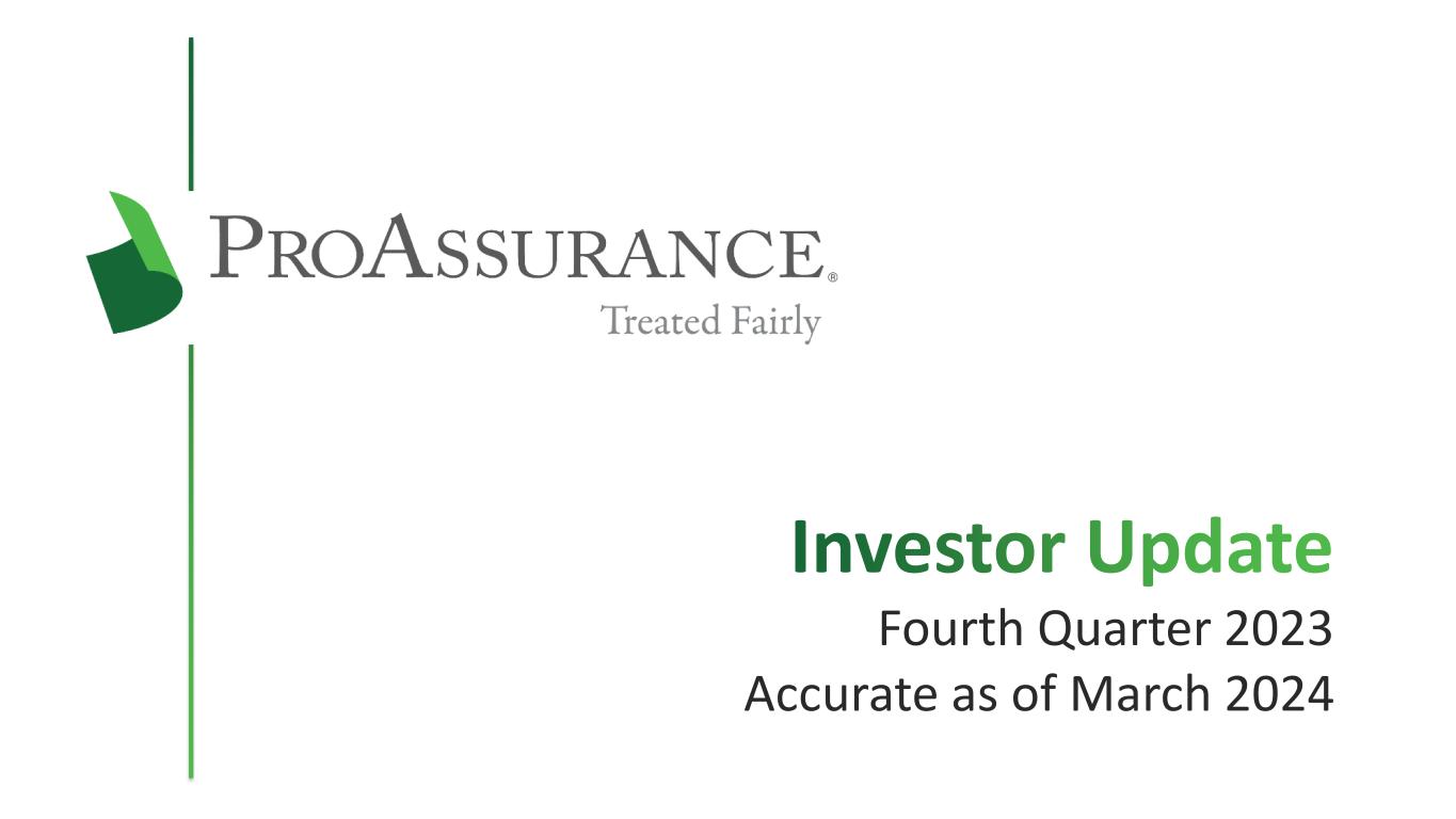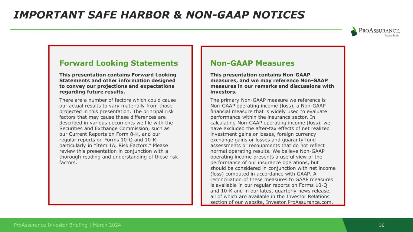 ProAssurance Investor Briefing | March 2024 30 Forward Looking Statements Non-GAAP Measures This presentation contains Forward Looking Statements and other information designed to convey our projections and expectations regarding future results. There are a number of factors which could cause our actual results to vary materially from those projected in this presentation. The principal risk factors that may cause these differences are described in various documents we file with the Securities and Exchange Commission, such as our Current Reports on Form 8-K, and our regular reports on Forms 10-Q and 10-K, particularly in “Item 1A, Risk Factors.” Please review this presentation in conjunction with a thorough reading and understanding of these risk factors. This presentation contains Non-GAAP measures, and we may reference Non-GAAP measures in our remarks and discussions with investors. The primary Non-GAAP measure we reference is Non-GAAP operating income (loss), a Non-GAAP financial measure that is widely used to evaluate performance within the insurance sector. In calculating Non-GAAP operating income (loss), we have excluded the after-tax effects of net realized investment gains or losses, foreign currency exchange gains or losses and guaranty fund assessments or recoupments that do not reflect normal operating results. We believe Non-GAAP operating income presents a useful view of the performance of our insurance operations, but should be considered in conjunction with net income (loss) computed in accordance with GAAP. A reconciliation of these measures to GAAP measures is available in our regular reports on Forms 10-Q and 10-K and in our latest quarterly news release, all of which are available in the Investor Relations section of our website, Investor.ProAssurance.com. IMPORTANT SAFE HARBOR & NON-GAAP NOTICES