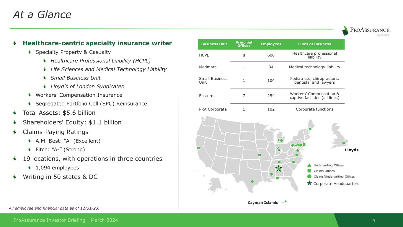 ProAssurance Investor Briefing | March 2024 3 Mission, Vision, & Values The ProAssurance Mission We Protect Others. Corporate Values Integrity | Leadership | Relationships | Enthusiasm Our Brand Promise We will honor these values in the execution of treated fairly to perform our mission and realize our vision.