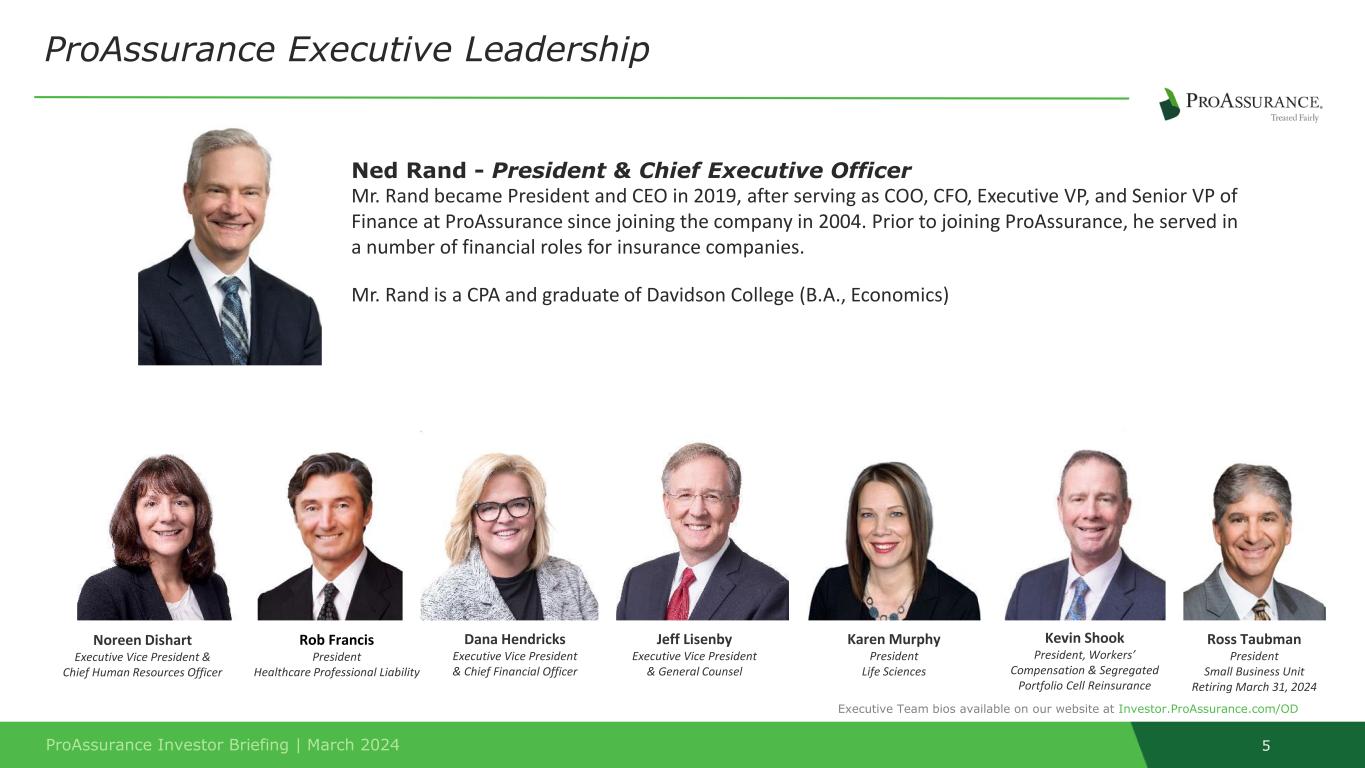 ProAssurance Investor Briefing | March 2024 4 At a Glance All employee and financial data as of 12/31/23. Business Unit Principal Offices Employees Lines of Business HCPL 8 600 Healthcare professional liability Medmarc 1 34 Medical technology liability Small Business Unit 1 104 Podiatrists, chiropractors, dentists, and lawyers Eastern 7 254 Workers’ Compensation & captive facilities (all lines) PRA Corporate 1 102 Corporate functions Healthcare-centric specialty insurance writer Specialty Property & Casualty Healthcare Professional Liability (HCPL) Life Sciences and Medical Technology Liability Small Business Unit Lloyd’s of London Syndicates Workers' Compensation Insurance Segregated Portfolio Cell (SPC) Reinsurance Total Assets: $5.6 billion Shareholders' Equity: $1.1 billion Claims-Paying Ratings A.M. Best: “A” (Excellent) Fitch: “A-” (Strong) 19 locations, with operations in three countries 1,094 employees Writing in 50 states & DC Corporate Headquarters Claims Offices Claims/Underwriting Offices Underwriting Offices Cayman Islands Lloyds