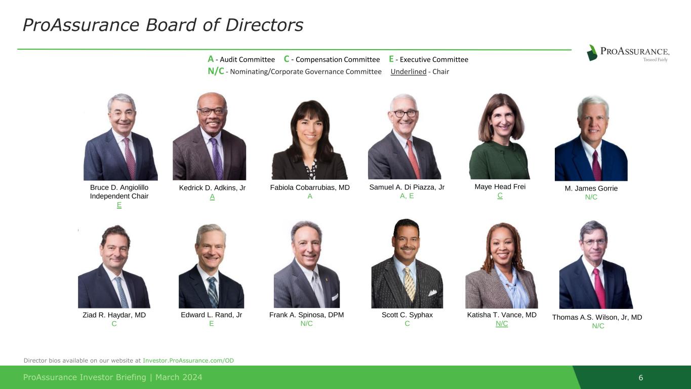 ProAssurance Investor Briefing | March 2024 5 ProAssurance Executive Leadership Ned Rand - President & Chief Executive Officer Mr. Rand became President and CEO in 2019, after serving as COO, CFO, Executive VP, and Senior VP of Finance at ProAssurance since joining the company in 2004. Prior to joining ProAssurance, he served in a number of financial roles for insurance companies. Mr. Rand is a CPA and graduate of Davidson College (B.A., Economics) Executive Team bios available on our website at Investor.ProAssurance.com/OD Kevin Shook President, Workers’ Compensation & Segregated Portfolio Cell Reinsurance Noreen Dishart Executive Vice President & Chief Human Resources Officer Dana Hendricks Executive Vice President & Chief Financial Officer Jeff Lisenby Executive Vice President & General Counsel Karen Murphy President Life Sciences Rob Francis President Healthcare Professional Liability Ross Taubman President Small Business Unit Retiring March 31, 2024