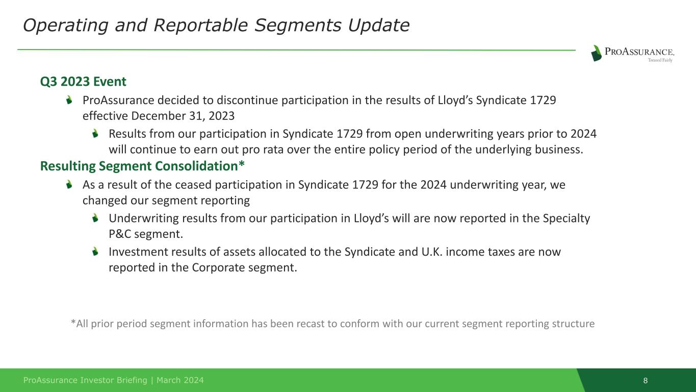 ProAssurance Investor Briefing | March 2024 7 ProAssurance Brand Profile Specialty P&C Healthcare Professional Liability Workers’ Comp Alternative Risk Transfer Medical Technology & Life Sciences Products Liability Legal Professional Liability