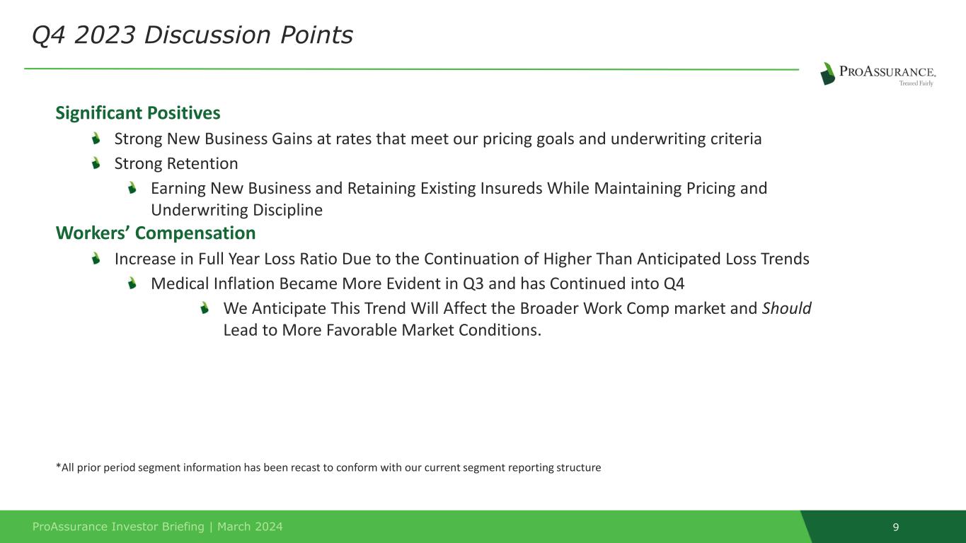 ProAssurance Investor Briefing | March 2024 8 Operating and Reportable Segments Update Q3 2023 Event ProAssurance decided to discontinue participation in the results of Lloyd’s Syndicate 1729 effective December 31, 2023 Results from our participation in Syndicate 1729 from open underwriting years prior to 2024 will continue to earn out pro rata over the entire policy period of the underlying business. Resulting Segment Consolidation* As a result of the ceased participation in Syndicate 1729 for the 2024 underwriting year, we changed our segment reporting Underwriting results from our participation in Lloyd’s will are now reported in the Specialty P&C segment. Investment results of assets allocated to the Syndicate and U.K. income taxes are now reported in the Corporate segment. *All prior period segment information has been recast to conform with our current segment reporting structure