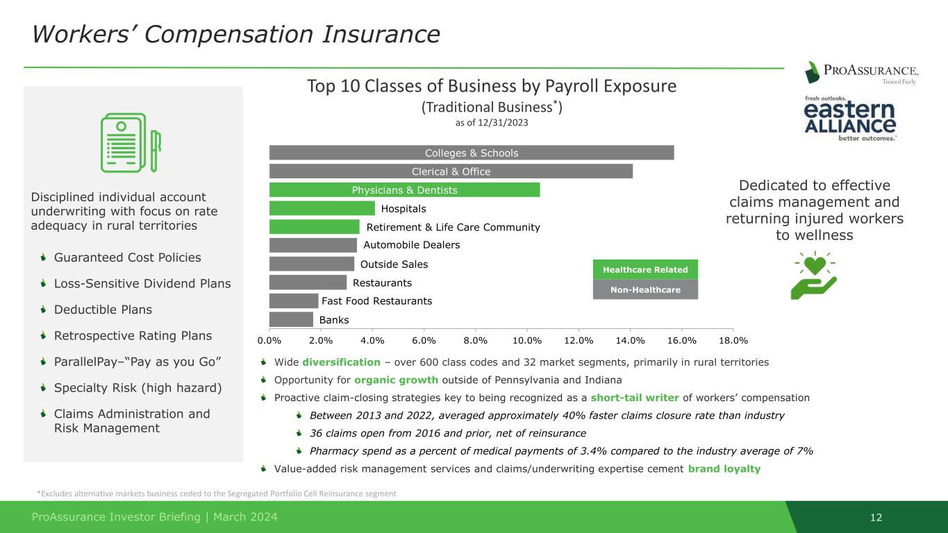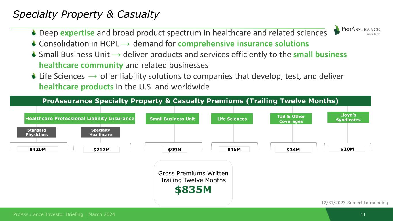 ProAssurance Investor Briefing | March 2024 10 ProAssurance Specialty Property & Casualty • Healthcare Professional Liability (HCPL) insures healthcare providers and facilities, including E&S coverages • The Small Business Unit insures podiatrists, chiropractors, dentists, and lawyers • Medmarc insures medical technology and life sciences companies that manufacture or distribute products and those conducting clinical trials • Includes the underwriting results from our participation in Lloyd's of London Syndicate 1729 and 6131 Eastern Alliance Workers’ Compensation • Specialty underwriter of workers’ compensation products and services • Focused in the East, South, and Midwest regions of the United States • Guaranteed cost, policyholder dividend, retro-rated, deductible, and alternative solutions policies available Inova Re/Eastern Re SPC Reinsurance • Segregated Portfolio Company structure • Workers’ compensation and healthcare professional liability coverage in a Cayman-based captive • Industries include healthcare, forestry, staffing, construction, petroleum, marine and recreation, and social services ProAssurance Corporate • Reports our investment results, interest expense, and U.S. income taxes • Includes corporate expenses and includes non-premium revenues generated outside of our insurance entities • Company-wide administrative departments reside in ProAssurance Corporate • Includes Investment results and assets solely allocated to our Lloyd’s Syndicate operations, net of U.K. income tax expense ProAssurance Reports Financial Results in Four Segments