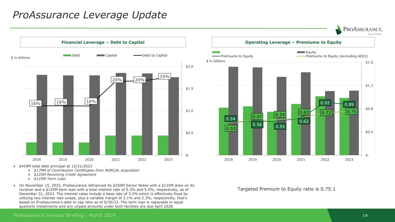 ProAssurance Investor Briefing | March 2024 14 $429M total debt principal at 12/31/2023 $179M of Contribution Certificates from NORCAL acquisition $125M Revolving Credit Agreement $125M Term Loan On November 15, 2023, ProAssurance refinanced its $250M Senior Notes with a $125M draw on its revolver and a $125M term loan with a total interest rate of 5.3% and 5.5%, respectively, as of December 31, 2023. The interest rates include a base rate of 3.2% which is effectively fixed by utilizing two interest rate swaps, plus a variable margin of 2.1% and 2.3%, respectively, that’s based on ProAssurance’s debt to cap ratio as of 9/30/23. The term loan is repayable in equal quarterly installments and any unpaid amounts under both facilities are due April 2028. ProAssurance Leverage Update Targeted Premium to Equity ratio is 0.75:1 Financial Leverage – Debt to Capital Operating Leverage – Premiums to Equity 16% 16% 16% 24% 24% 25% $- $0.5 $1.0 $1.5 $2.0 2018 2019 2020 2021 2022 2023 $ in billions Debt Capital Debt to Capital 0.54 0.56 0.55 0.62 0.92 0.89 0.53 0.57 0.59 0.63 0.72 0.75 $- $0.4 $0.8 $1.2 $1.6 2018 2019 2020 2021 2022 2023 $ in billions Net Premiums Written Equity Premiums to Equity Premiums to Equity (excluding AOCI)